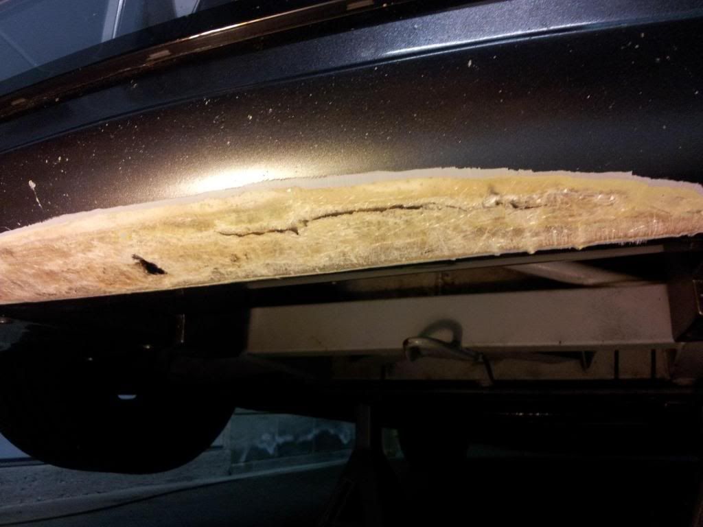 Here is a picture of the hole and the split. The plan is to just add filler on the outside..it's quite difficult to do anything from the inside as there is the charcoal canister under the A/C rad
