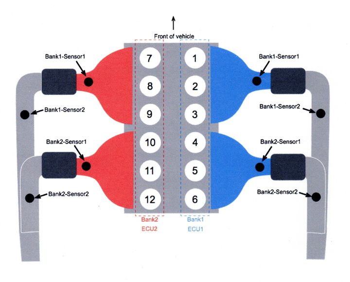The Fowell reads and reports on the ECU's independently: I believe it should list them as "12 Cylinder EMS-P" and "12 Cylinder EMS-S" (the P and S representing the Primary and Secondary ECUs, respectively). This means that the Primary is for the left bank, looking from the front of the car, while the right bank is Secondary (I hesitate to use "driver" and "passenger" sides as I'm in Canada). Given that, you still need to see which bank it is referring to (Primary or Secondary) but the Bank 2 Sensor 1 position is the rear pre-cat sensor, mounted near the top of the manifold - and much more easily reached than the post-cat position, mounted closer to where the mid-pipe joins the manifold.