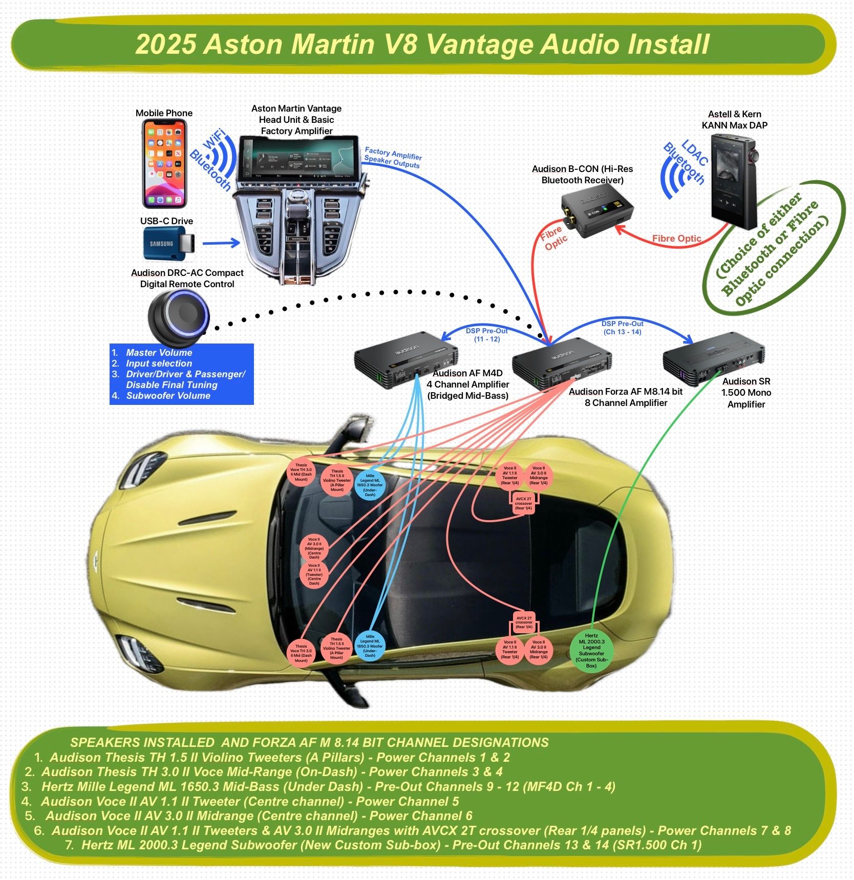 My solution was to go and find a top notch audio installer with whom I could work (Enhance Car Audio & Security in Sittingbourne, UK) to design an audio system from the ground up, and totally ignore the Aston system. You’ll see from the following diagram what the final installation looks like, and I’m pleased to report that I’m very pleased with my new system, especially as I can easily play back high resolution, quality music, using my Astell & Kern Digital Audio Player (DAP). Another huge advantage in not using any part of the Aston’s audio chain for listening to music is that I no longer have to tolerate Aston’s ‘Fake’ engine noise.
