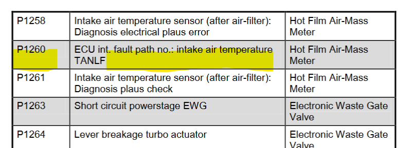 Thanks for this! I can make these checks maybe over the holidays. I did replace the MAF with new and no joy. I will try to document for this thread and hopefully helps anyone else.Thanks to Mr. Z - I expected, with a tune reflash, it would take P1260 out as the entire contents of the data tables are removed and replaced with a new set in a tune. I've done numerous tunes on other cars in the past but no longer, and this was the case.