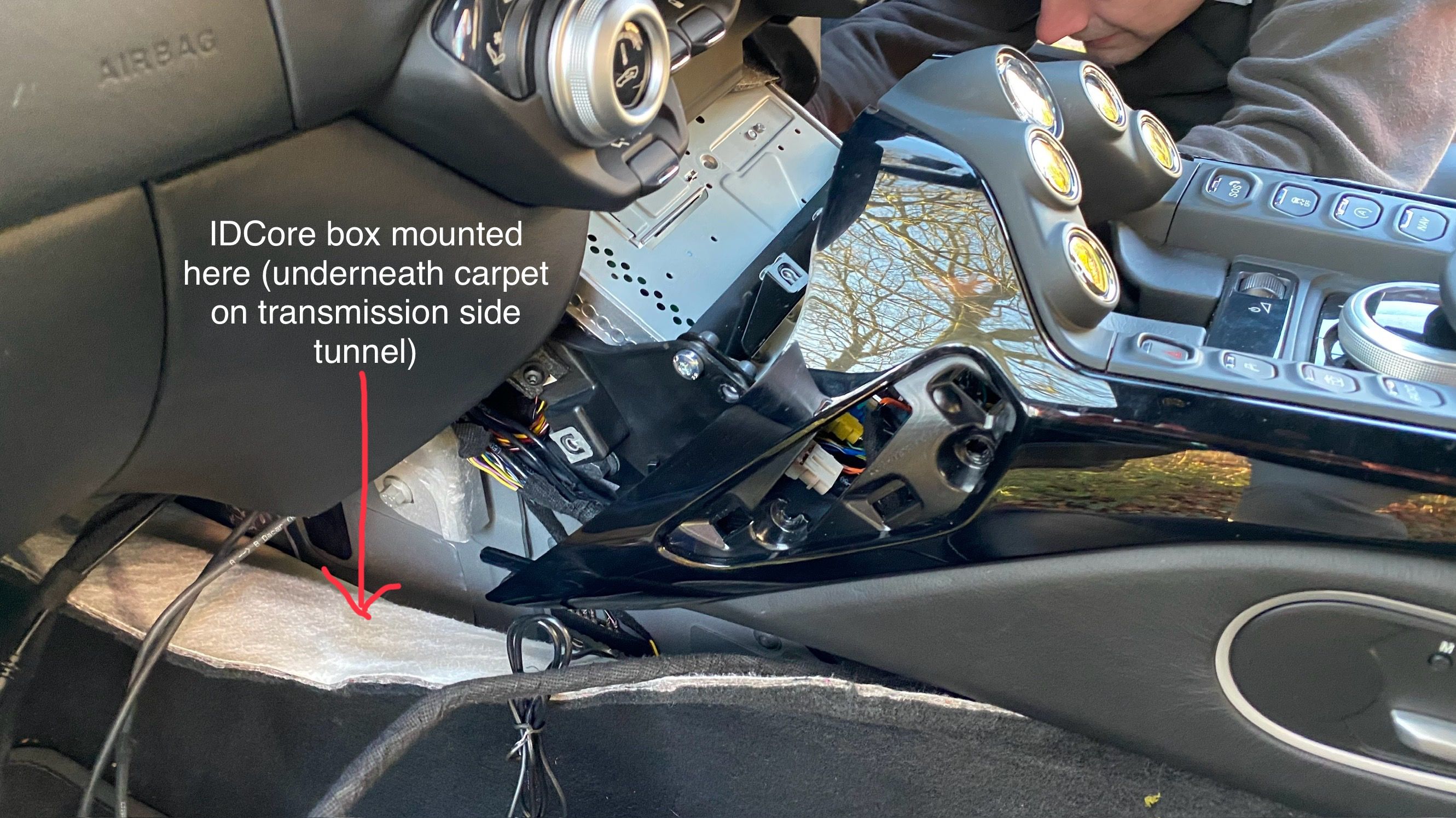 Thirdly, here’s the arrangement of USB sockets under my armrest. The audio out of the IDCore goes into USB 1 via the lead you can see plugged into USB1. USB 2 isn’t used by IDCore and is empty (as is the SD card slot). The USB socket on a short lead (far left) is USB input for the IDCore and allows wired connection of phone (use a Genuine APPLE LEAD for iPhone) or if in case you want to ‘mirror’ the phone (e.g. for watching YouTube when you’re stationary & parked up). I believe this is also the USB socket for updating firmware (using a USB stick containing the correct .BIN file).