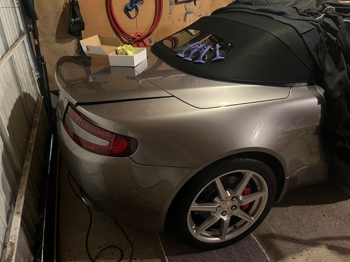 Just in process of taking my 2008 Vantage V8 convertible off the road for the winter. During its last wash and polish before hibernation, I noticed that the lower right corner off the glass rear windscreen appears to have come away from the convertible hood. Since I only drive it with hood down whenever possible, this hadn’t been something I’d noticed. Something like 15cm along the bottom of the glass is clearly detached from the hood material.