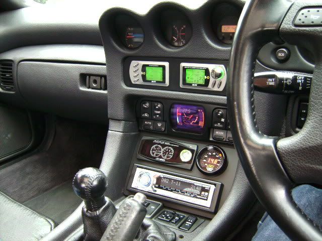 lol they aint really superfluous, they all have a job....apart from the top left unit (lit up green), thats quite gimmicky...its a 'power meter'. The one to the right of it is the boost controller...next down is the standard heating/air con controls. Beneath that and to the left is a fuel controller (intercepts the MAF to ECU signal wire and acts like a piggy back), the round dial to the right of that is the wideband gauge...need that to keep an eye on its neighbour lol. Beneath all that lot is the most vital part, a radio.Gassing Station | Japanese Chat | Top of Page | What's New | My Stuff