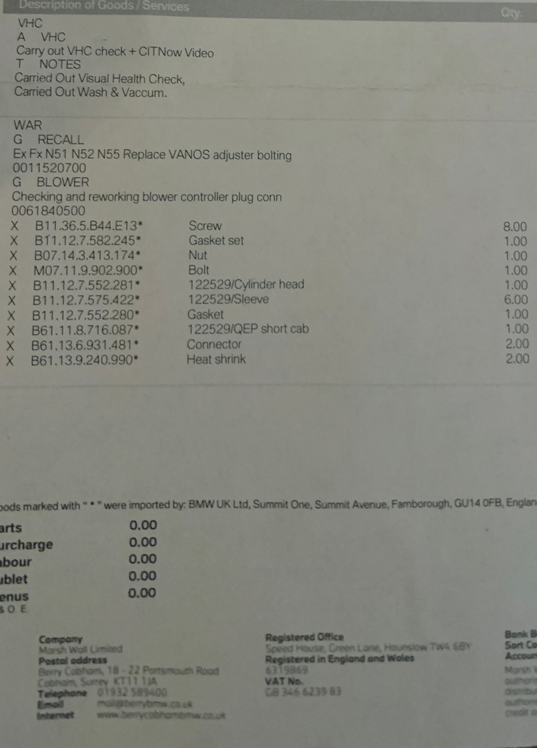 There was no mention of the vanos bolts being loose. Here is the invoice i received from them itemising what was done.