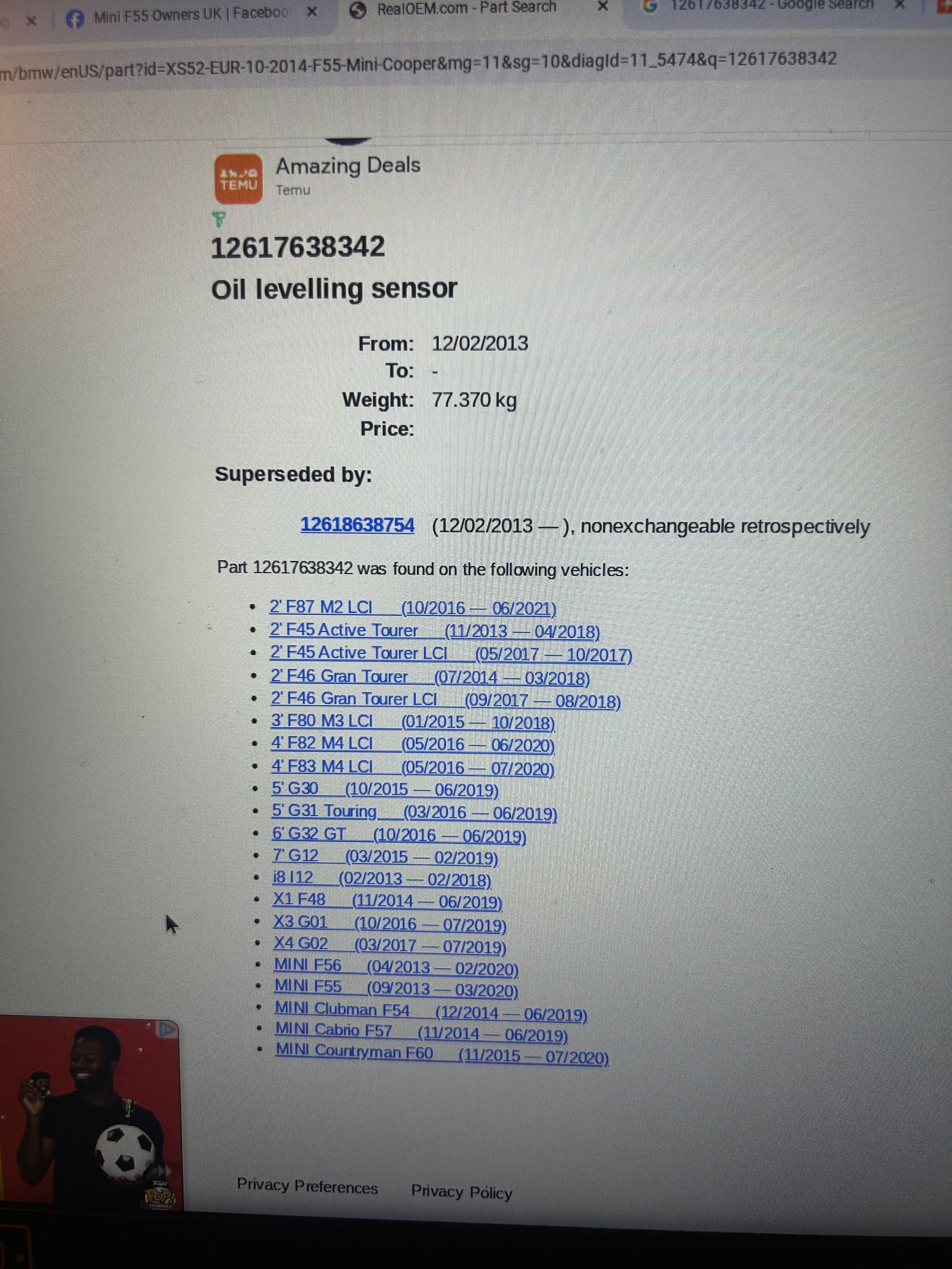 Hi, my oil level sensor after speaking to a BMW dealer was only produced for 1 year then the part number changed but not the unit (Hella was the manufacturer) i now have the part number 12617638342 and i now get the a aftermarket unit ...put your vin in realoem to the the right pn
