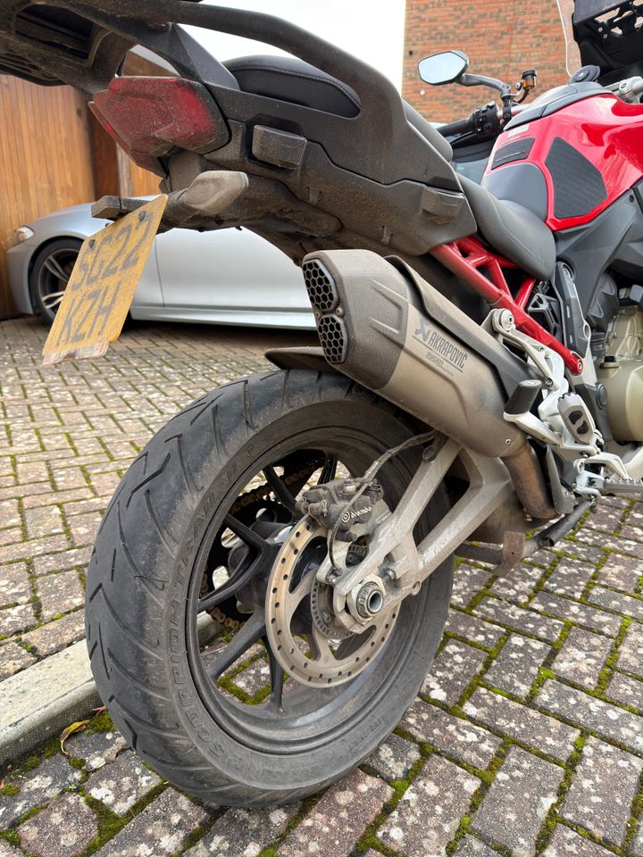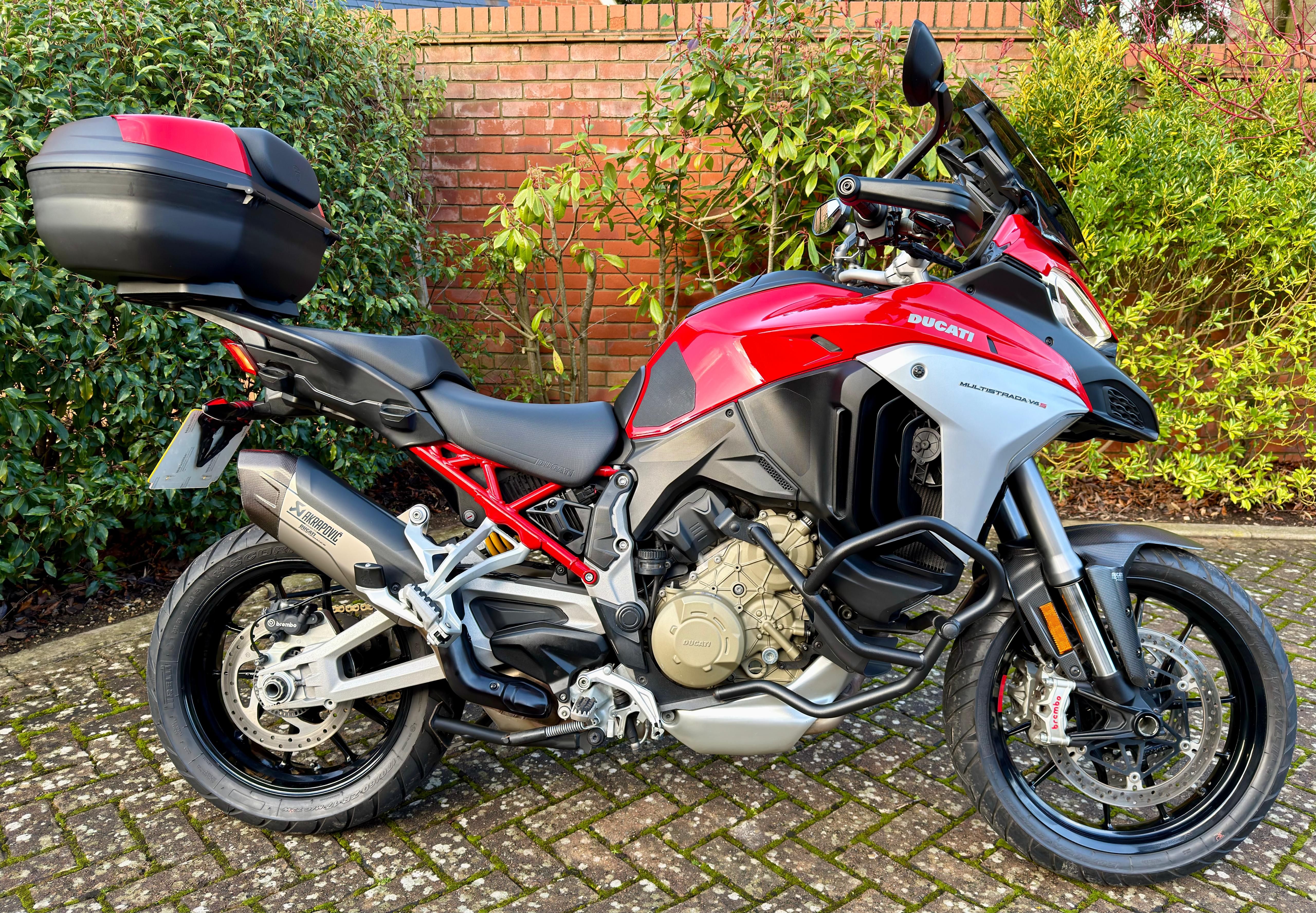 - not feeling held back, certainly shifting! I only used medium stiffness suspension, which wasn't bad, so it'll be interesting to see if soft or softest are as amusingly magic-carpet like as the GS.This is a very clean high 20s thousand mile example, with Akra, top case, panniers, radar, carbon bits, full Ducati history, from a Duc dealer, but was cheap - and I intend to use the hell out of it, so I think it makes sense financially