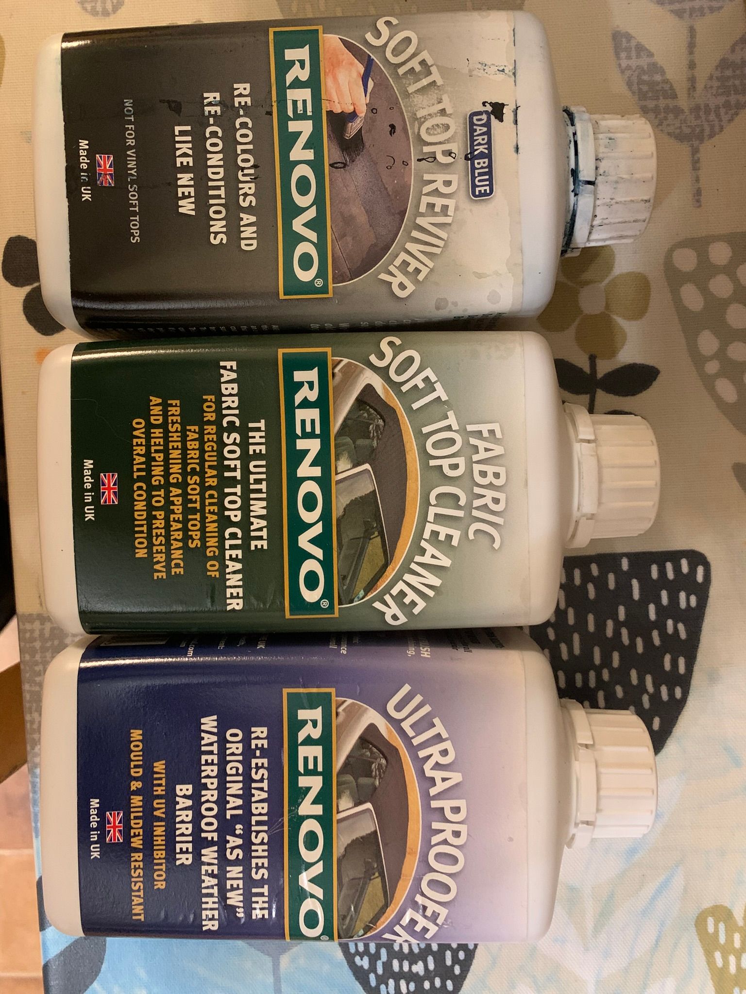 Free to good home, a Renovo cleaning, re-dyeing and waterproofing kit. I used this on my Chimaera a number of years ago and the kit contents still look great with barely any used. It really did the trick with my hood and targa top.