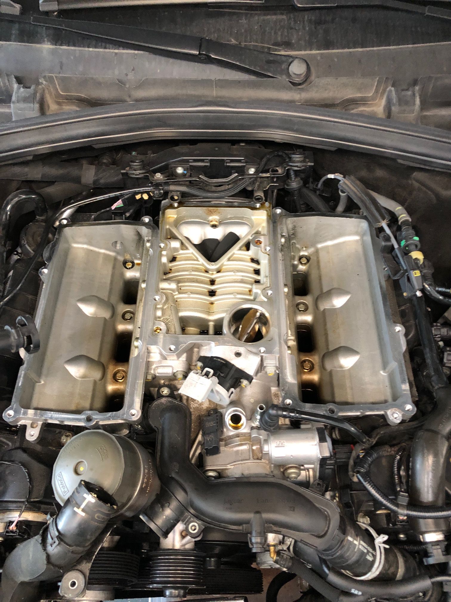 As I further examined the engine I found latent coolant puddled in the valley underneath the SC (very difficult to see with a high powered flashlight). Conclusion this was one of the plastic coolant piping that is underneath the SC (very common leak on these cars, both Jaguar and RR versions). This coolant system is one of the worst designs I've seen on any car in the last 40 years; As if it were designed as a high school project in a shop class.
