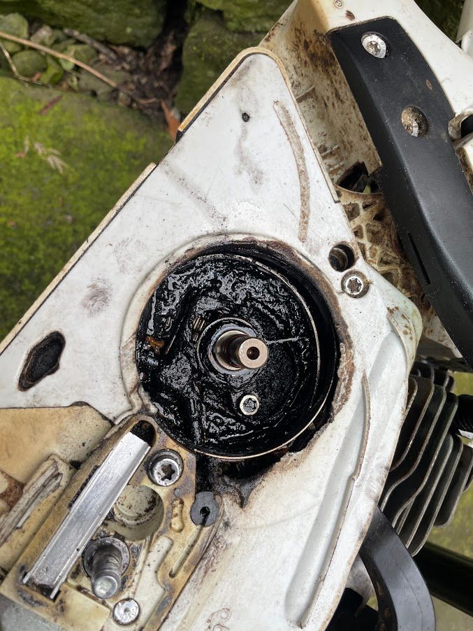 I inspected it and could see that the chain and bar were badly worn (i.e., beyond just dressing the bar and sharpening the chain). I took the bar off and established that the bar wasn't getting oil. Removing the clutch revealed this delightful mess: