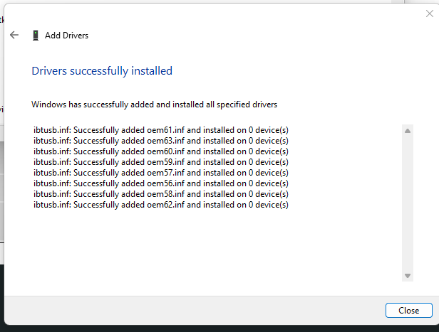 I tried manually adding the drivers via Device Manager, selecting from the folder they were in, and it said "installed on 0 devices"