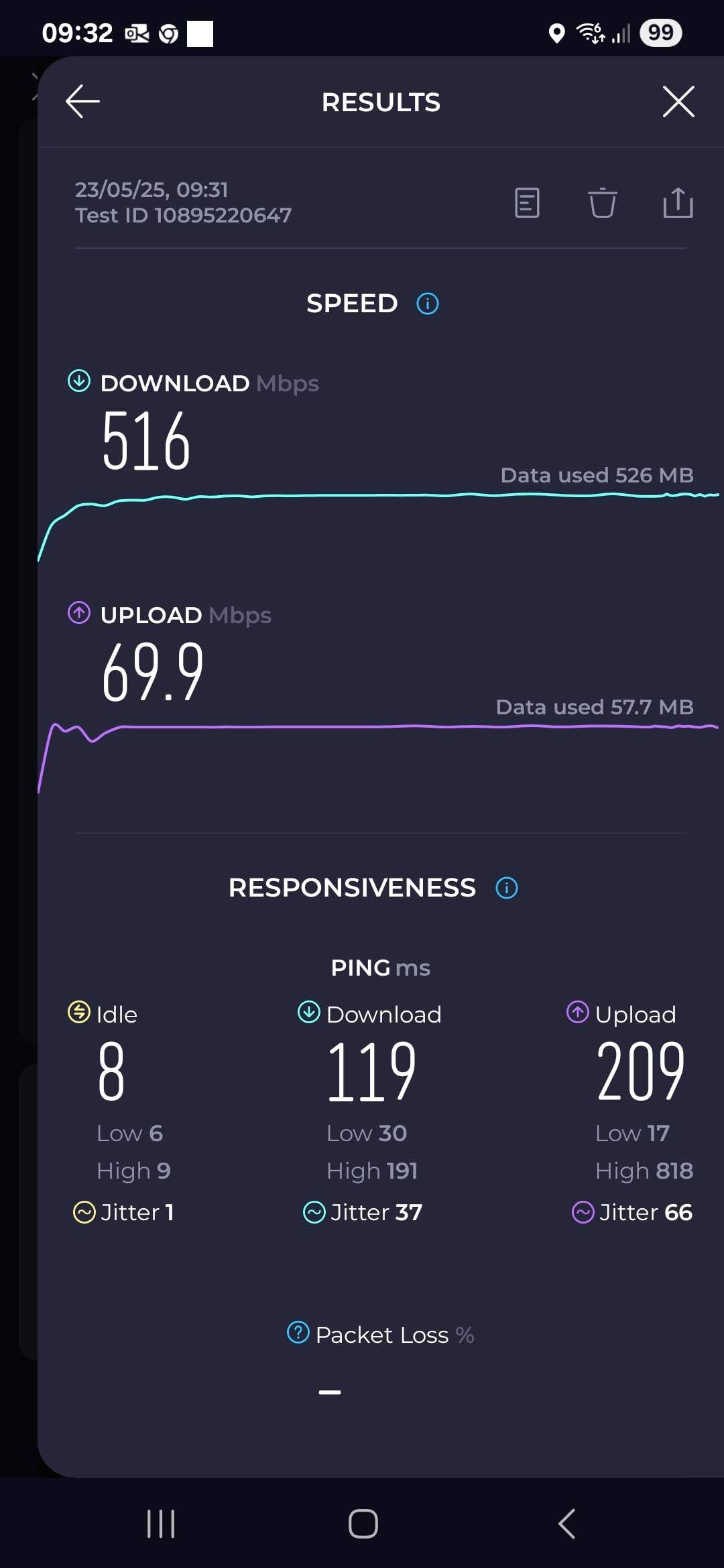 When I switch to the router wifi I see 500Mbps down and 72Mbps up. Signal strength -33dBm.