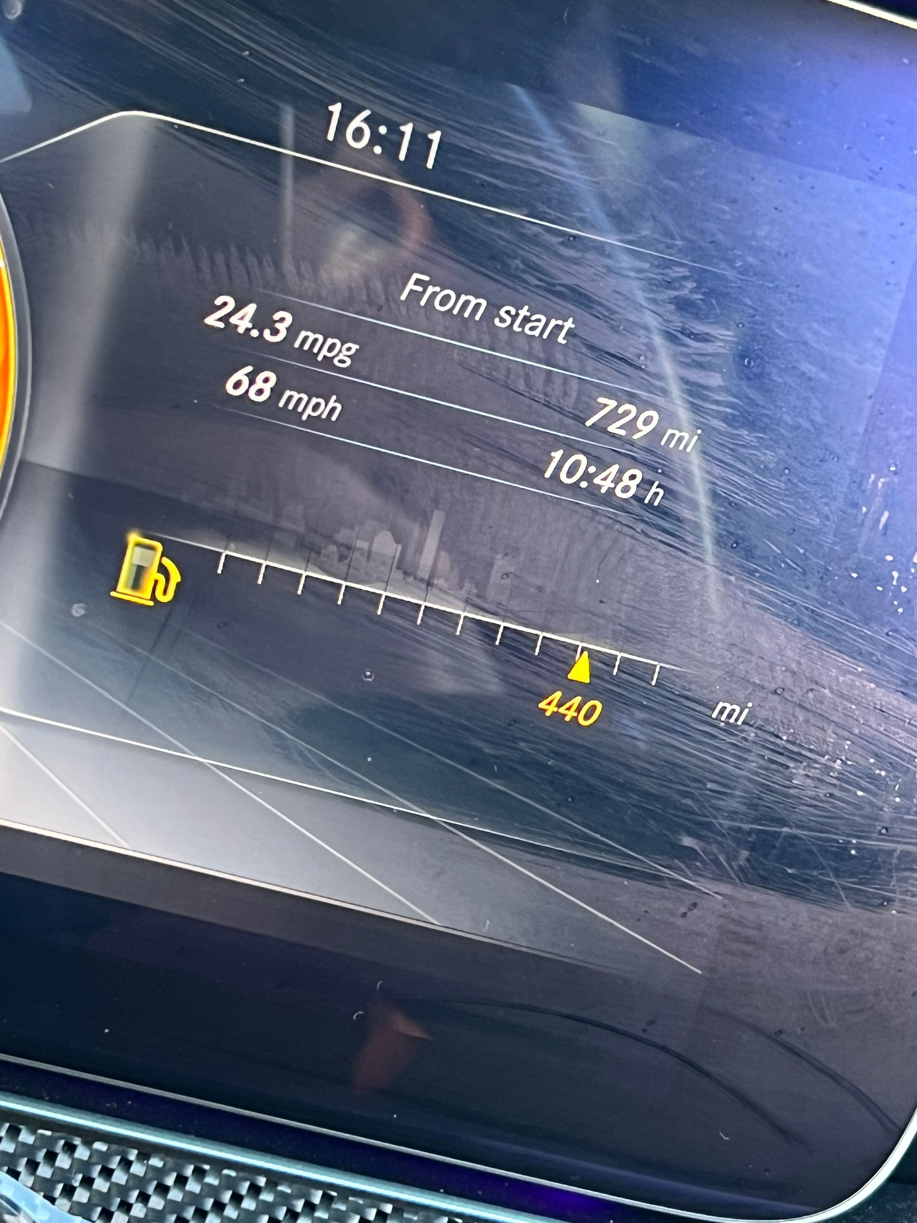 Averaging ~ 70mph over 700miles and getting mid 20s in a machine like that is pretty good I’d say. Sat at about 90mph on all motorways and demolished every car at every peage, the only car that put up a fight was a cayenne turbo s thing. I stopped in Chambery and at that point it was 24mpg over 729miles.