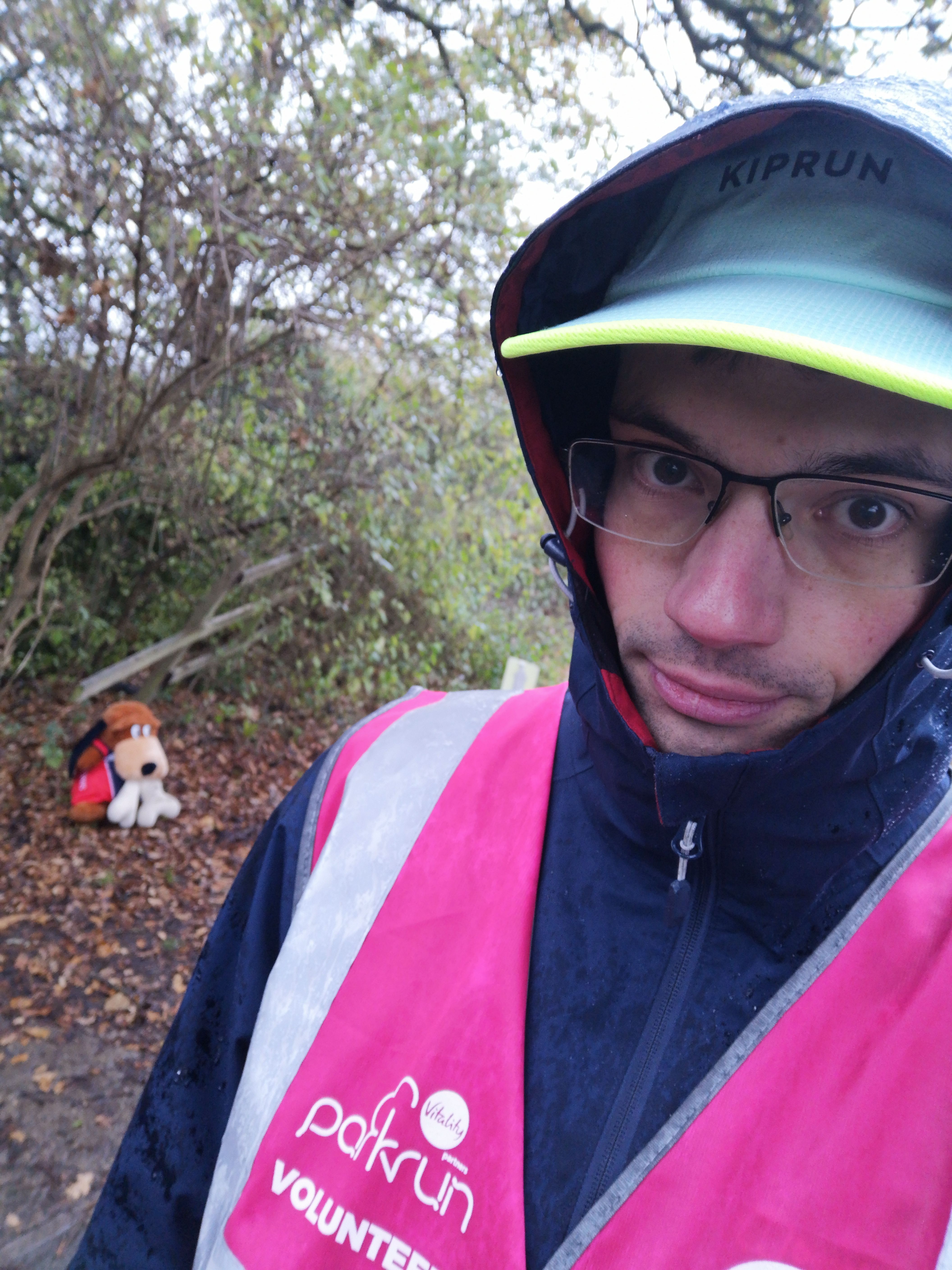 I wasn't too enthused about doing this parkrun before I left the house this morning, but once I was out of the door it was fine. We'd had a forecast for heavy rain for the entire duration of the run, but apart from a little drizzle on the warm-up run to the start, it was almost entirely rain free. Overnight rain had done its worst on the course, though. It was definitely a trail shoe kinda day, with wet roots, slick grass, and slippery mud in places. I stashed my rain jacket away before the start and risked it.