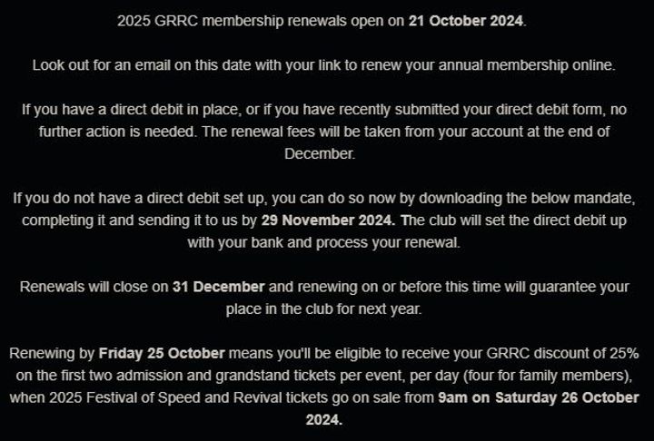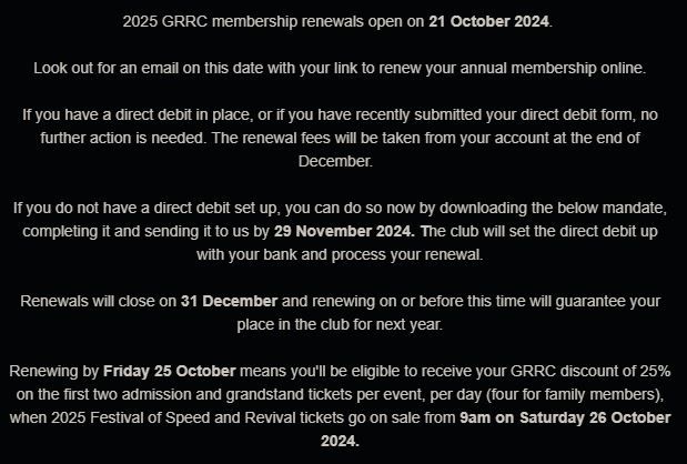 That is correct - your 25% ticket discount benefit remains for the duration of your current membership, but if you would like to buy tickets for the 2025 Festival of Speed and Goodwood Revival on or shortly after 26 October, when sales open to GRRC members, you must either have a current direct debit in place, or you must have renewed your membership for 2025. Edited by WhyOne on Wednesday 16th October 21:02