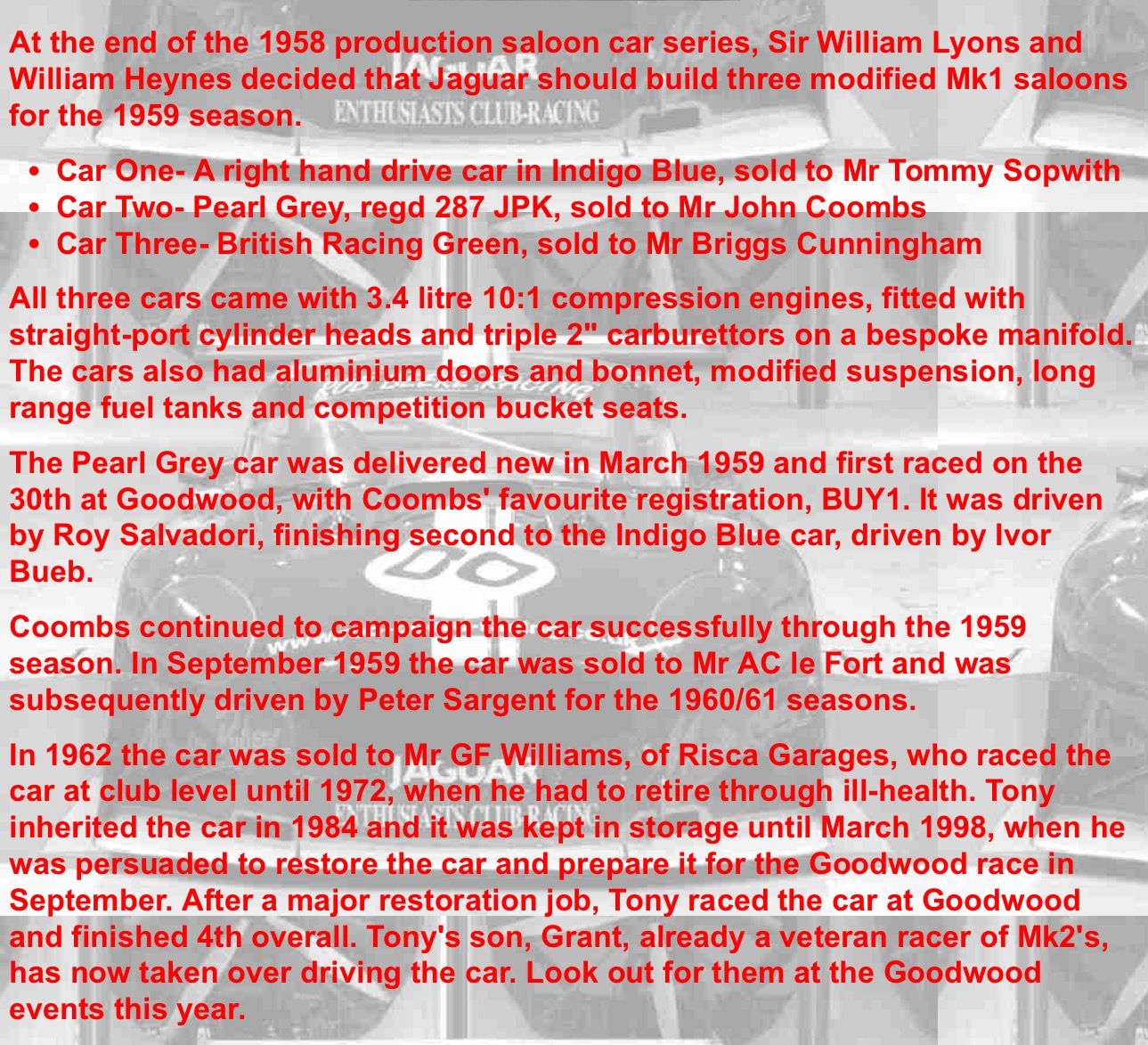 BUY 1, BUY 12, OWN 1 etc were all Coombs demo. plates. Coombs was taken over by Vines and the plates remain in Vines ownership. Afraid I don’t know if the William’s Jag. is one that used to wear BUY 1 in period. Gassing Station | Goodwood Events | Top of Page | What's New | My Stuff