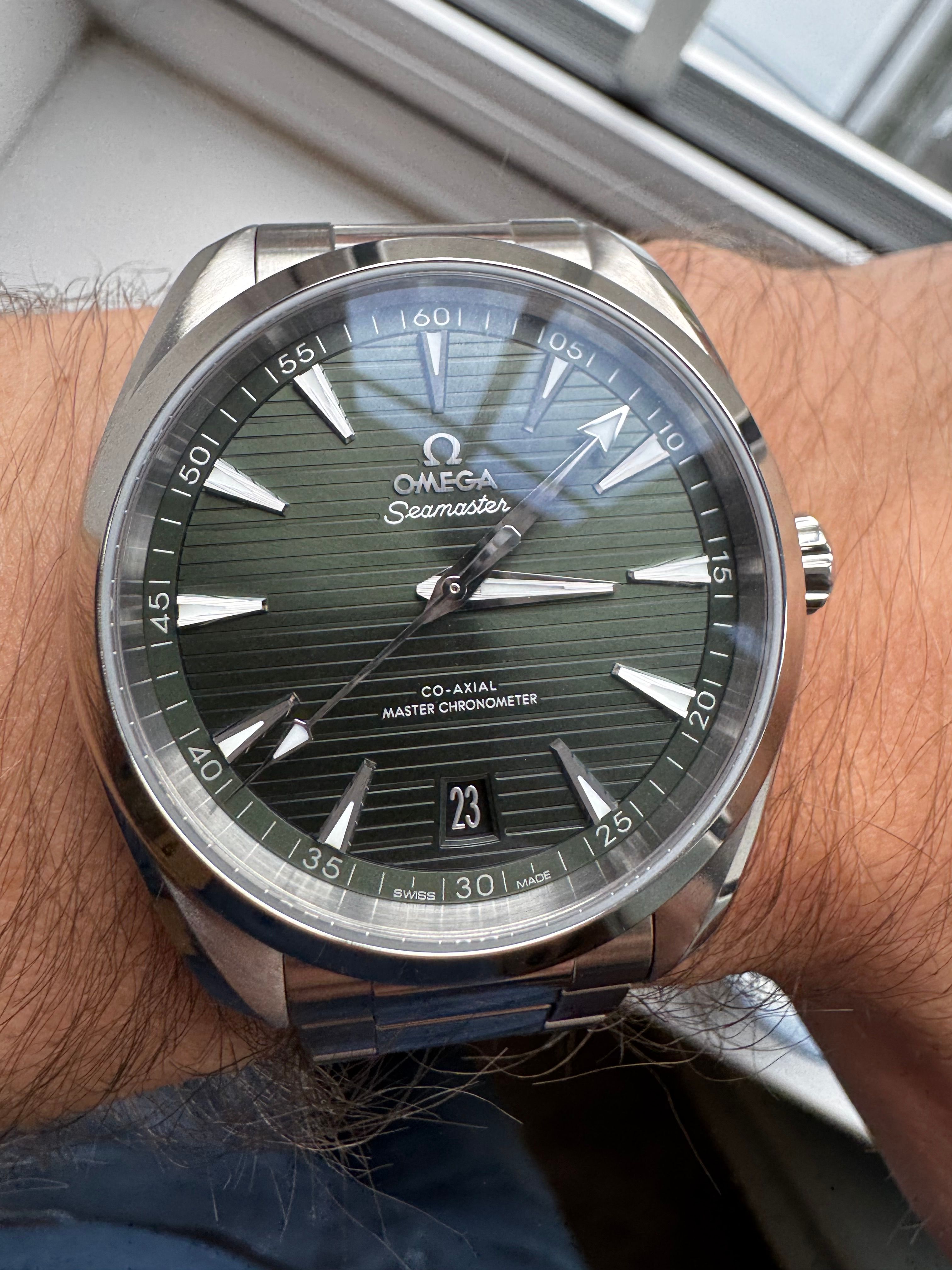 Difficult to catch the dial properly in light, so apologies for the rubbish pic, but picked this up a couple of days ago. 41mm green dial Aqua Terra. Loving the relative simplicity and clean lines.