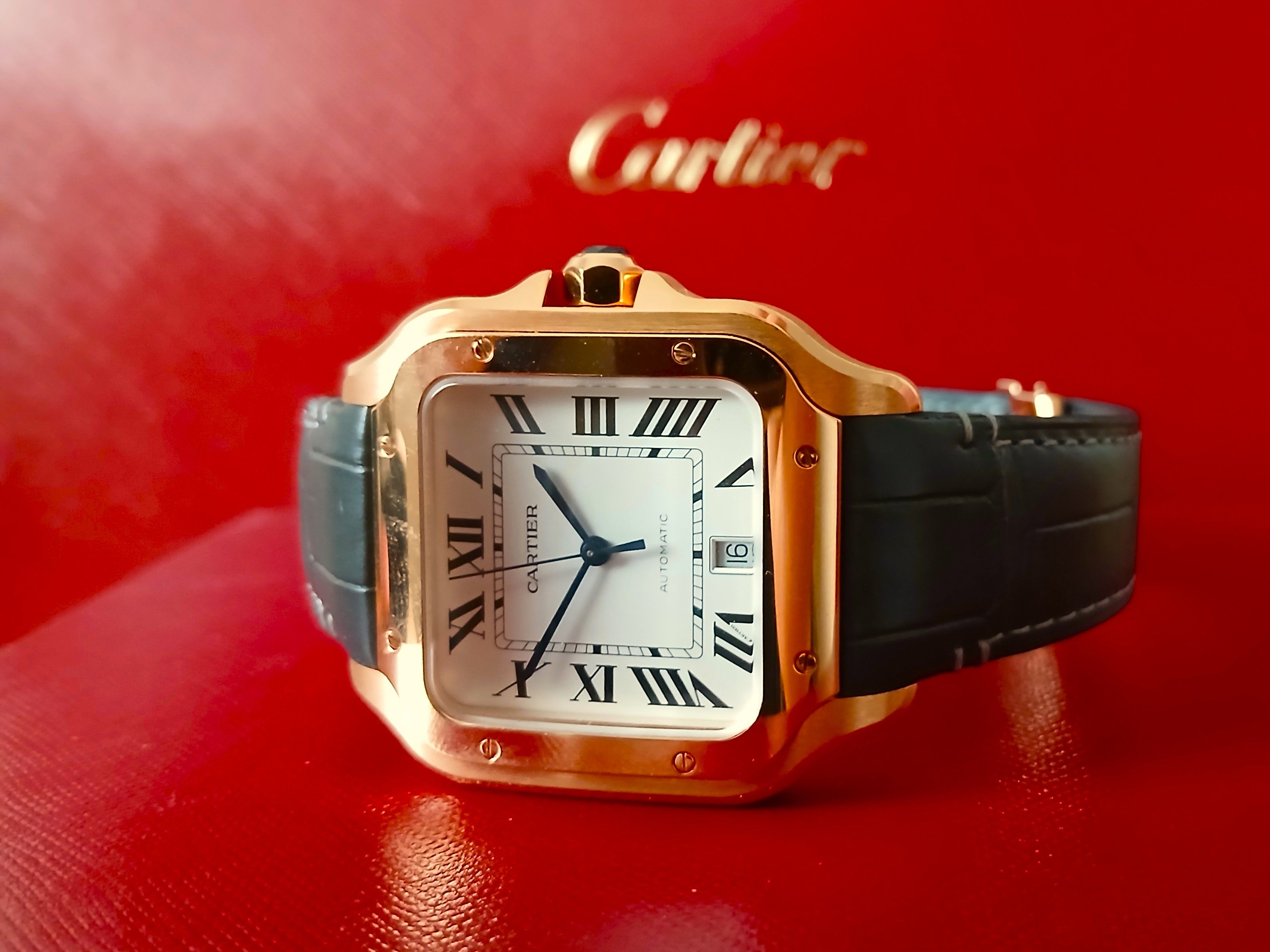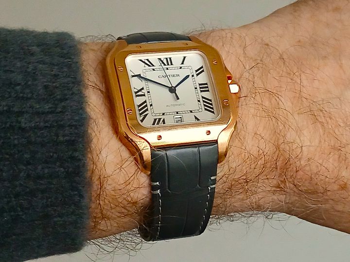 Just bought, this is the large model with a date, in rose gold, would've preferred the medium without a date, but it felt too small. Comes with two straps, Grey and Blue, with a deployant clasp. Also considered the new Tank Louis automatic, I may get that one next year..