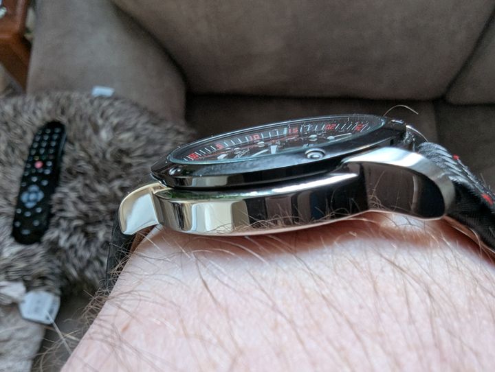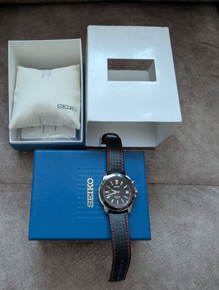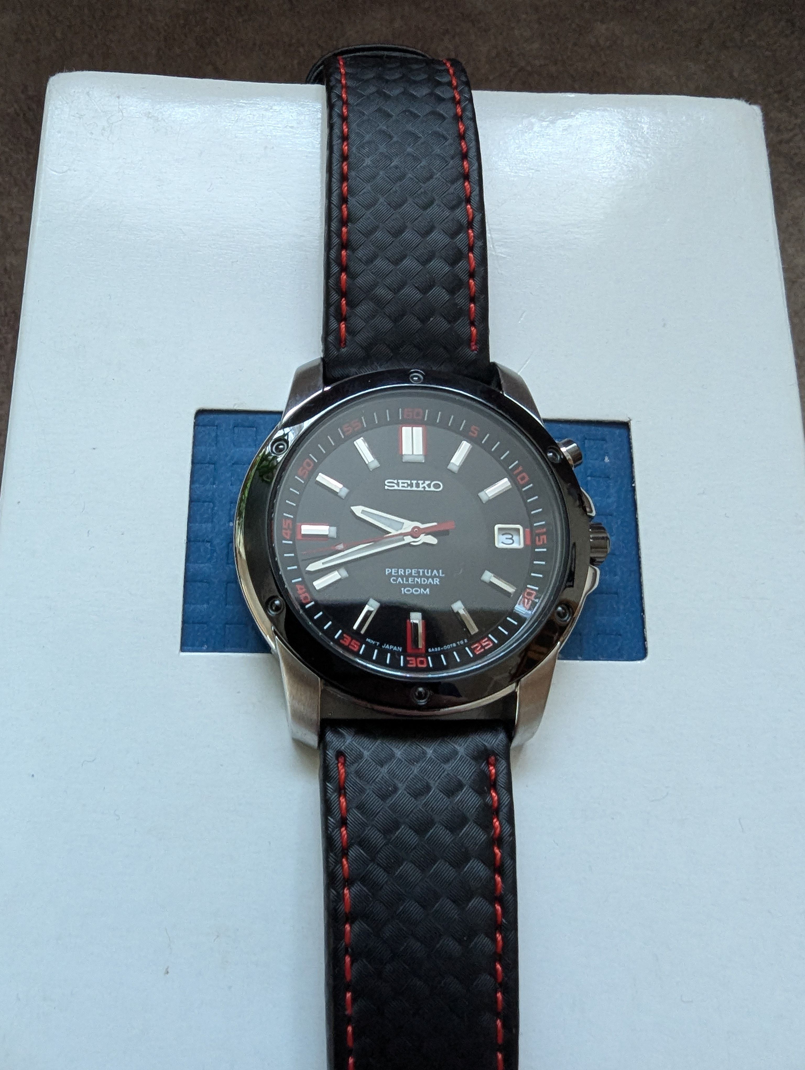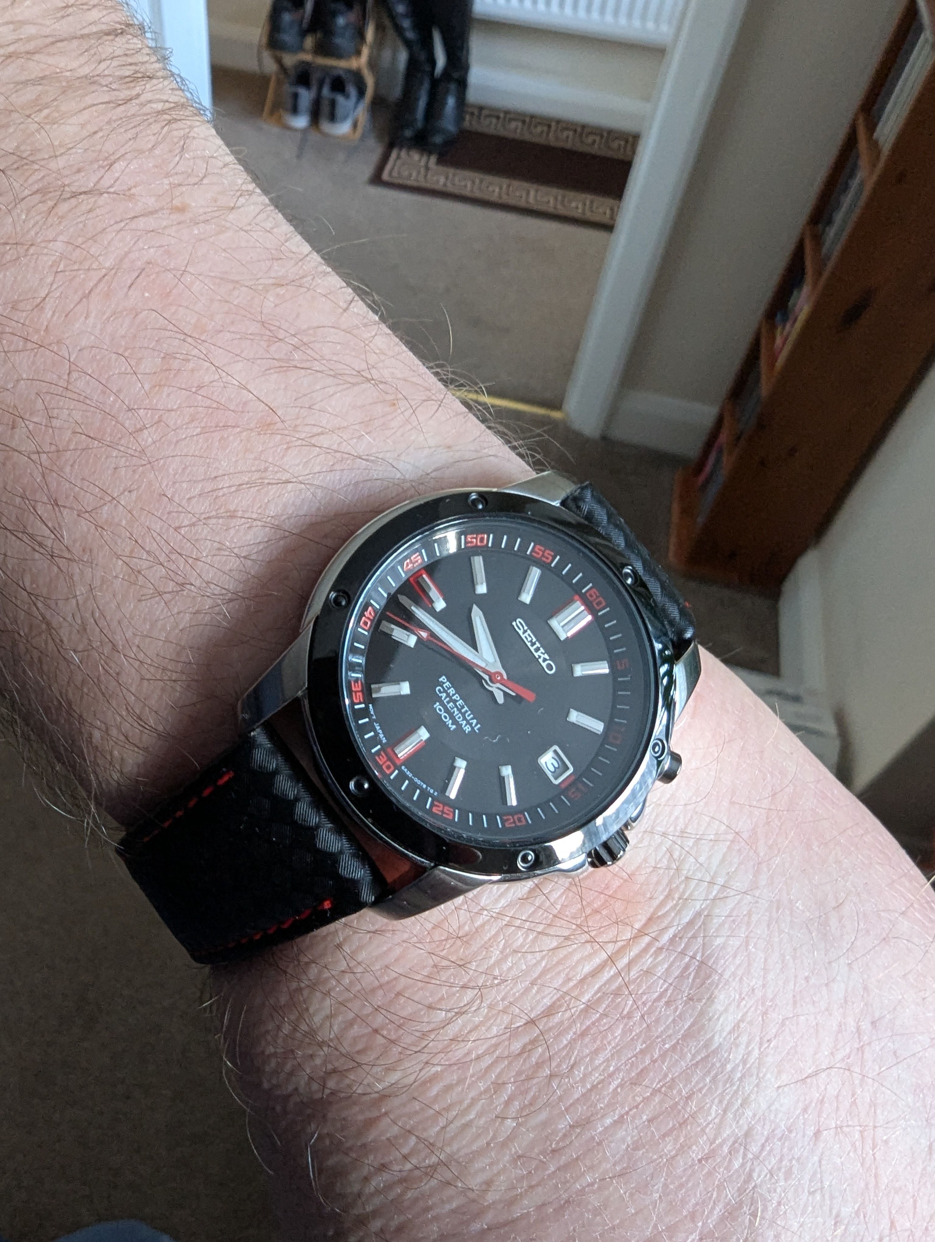 So Seiko update, it's an SNQ097 which is a quartz movement, black on black, red markers and stitching on the carbon effect leather strap, which is very supple, it's very thin and wears nicely on the wrist, smaller than I normally wear at 39mm but I'm really impressed with it so far.