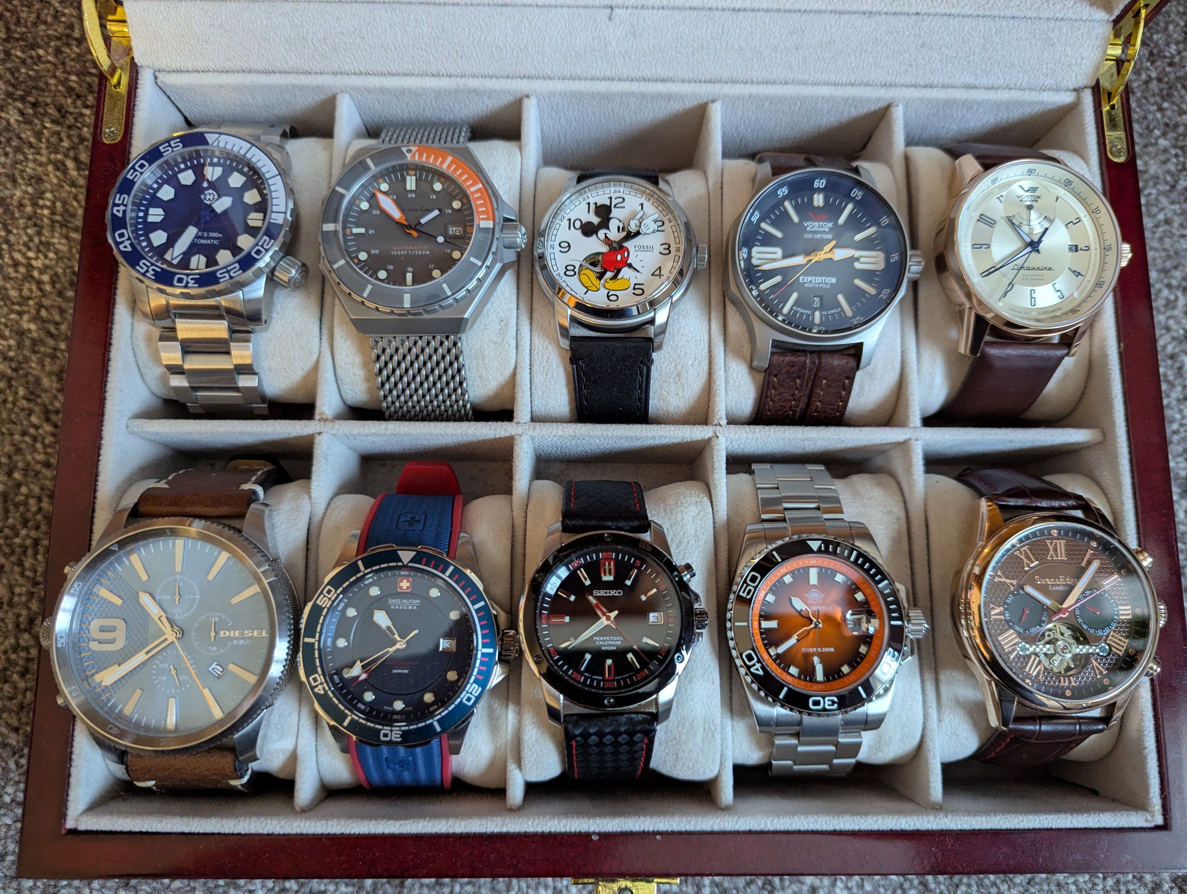 Second row left to right- Diesel Big Daddy, Hanowa Neptune, the new Seiko SNQ097, Addiesdive orange dial and Swan and Edgar.