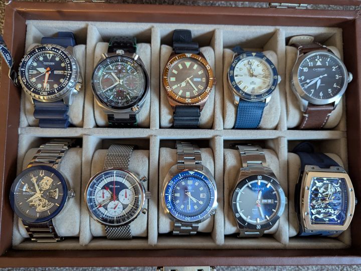 Top row left to right- Citizen diver, Citizen Promaster Bullhead, Citizen diver rare colour combination, Christopher Ward C65 Acquitain GMT, Christopher Ward C8 Pilots watch re-release.