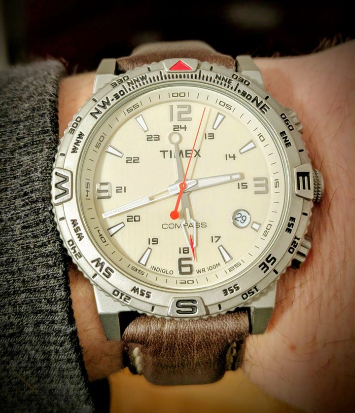Seems to have only been made for 3 years between 2014 and 2017 and uses the Timex Intelligent Quartz system, with the compass function. It's a T2P287 and has a lovely colour pallet with the ivory face - actually has a beautifully supple strap and the matt finish case is very different from anything else I own. Think it should be a nice smart casual daily-type wearer. The Indiglo isn't very bright but I think that's probably down to the cheap pound shop battery I found in the back of a drawer. Will swap a decent one in shortly and hopefully it'll brighten up a bit.