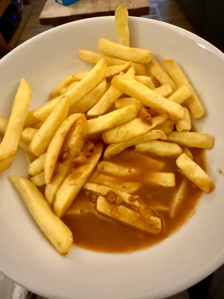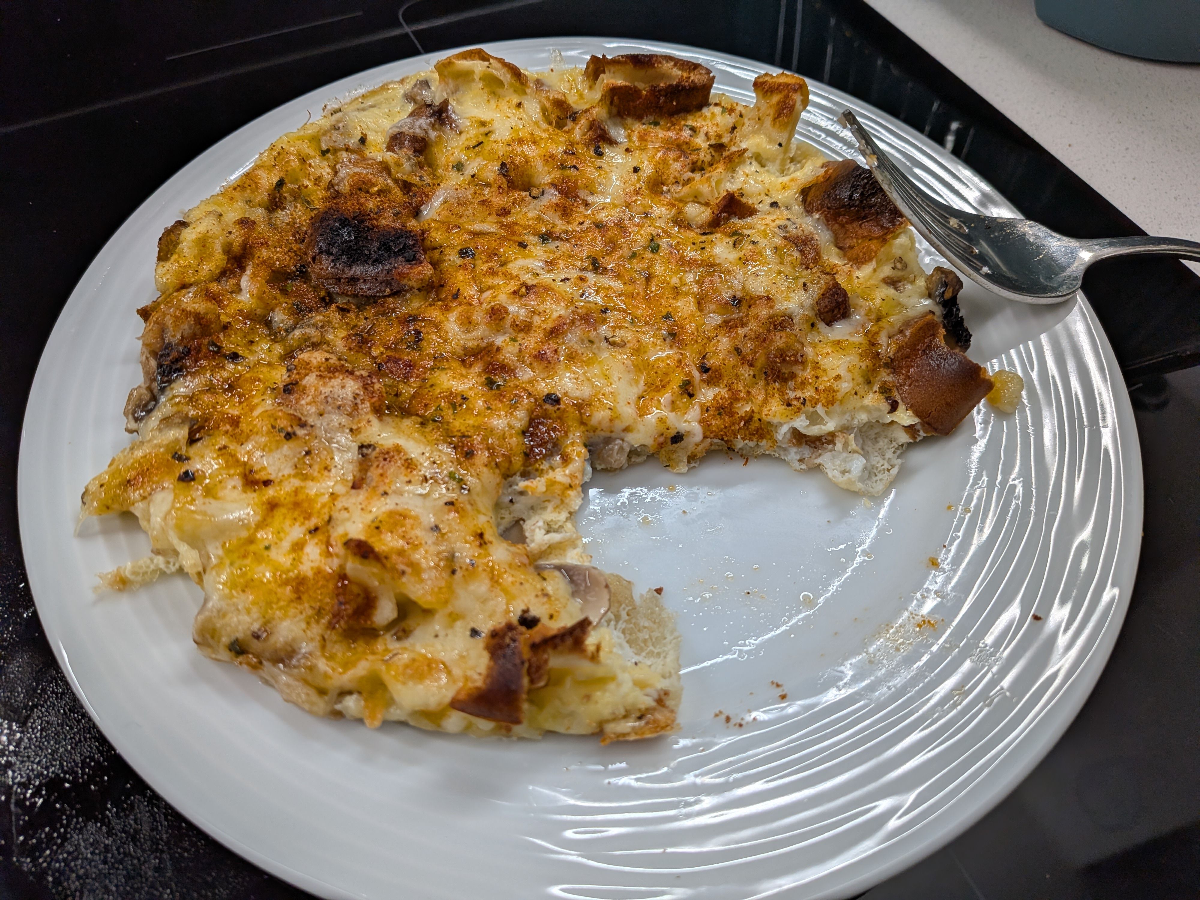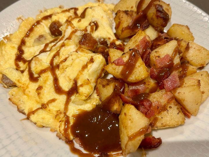 Another raid the fridge for what s left dinner. Omelette filled with sliced sausages and cheese, accompanied with some potato cubes which I seasoned well, air fried then tossed in some garlic butter and sprinkled with crispy bacon which I also did in air fryer. And of course, some HP brown sauce.