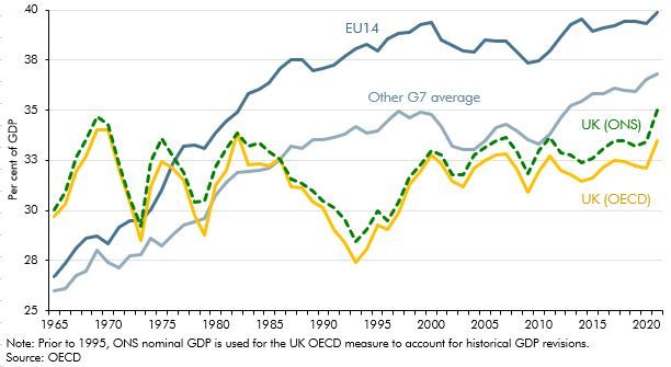 As the OBR data above made clear, by 1995 we were over 10 points off our peers (meaning their take was well over 50% greater than ours) yet we maintained the lunatic fallacy that we could have the same level and quality of public services.