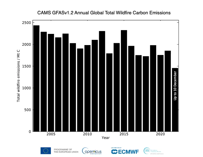 Total annual global emissions from wildfires, encompassing frequency and intensity, has in particular been decreasing overall across the last two decades, also with CO2 increasing (obviously).