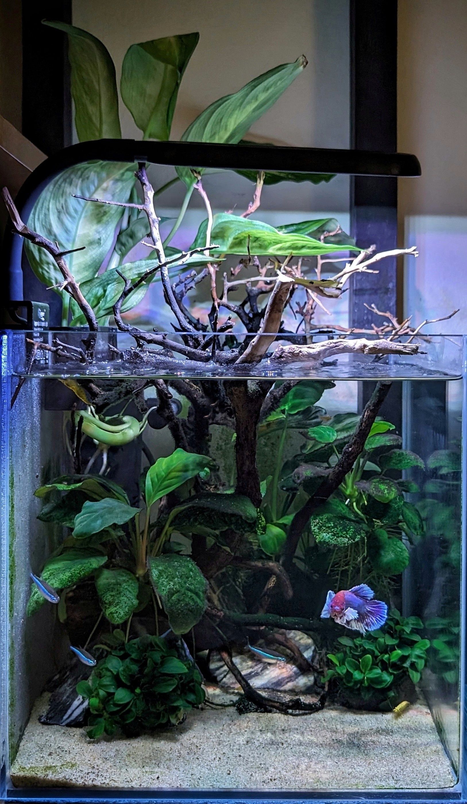 The fish went in, in waves. Beta and shrimps first, then half the tetras followed by the other half. The tank was stocked over a 3 week period after the initial settling in time with no fish. Maybe that was abit quick?