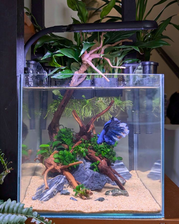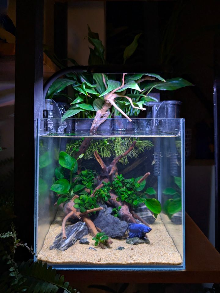 Spent a couple of hours yesterday completely breaking down the tank and rescaping, new wood, reused what anubias minicoin was viable and went lighter on the hardscape this time.