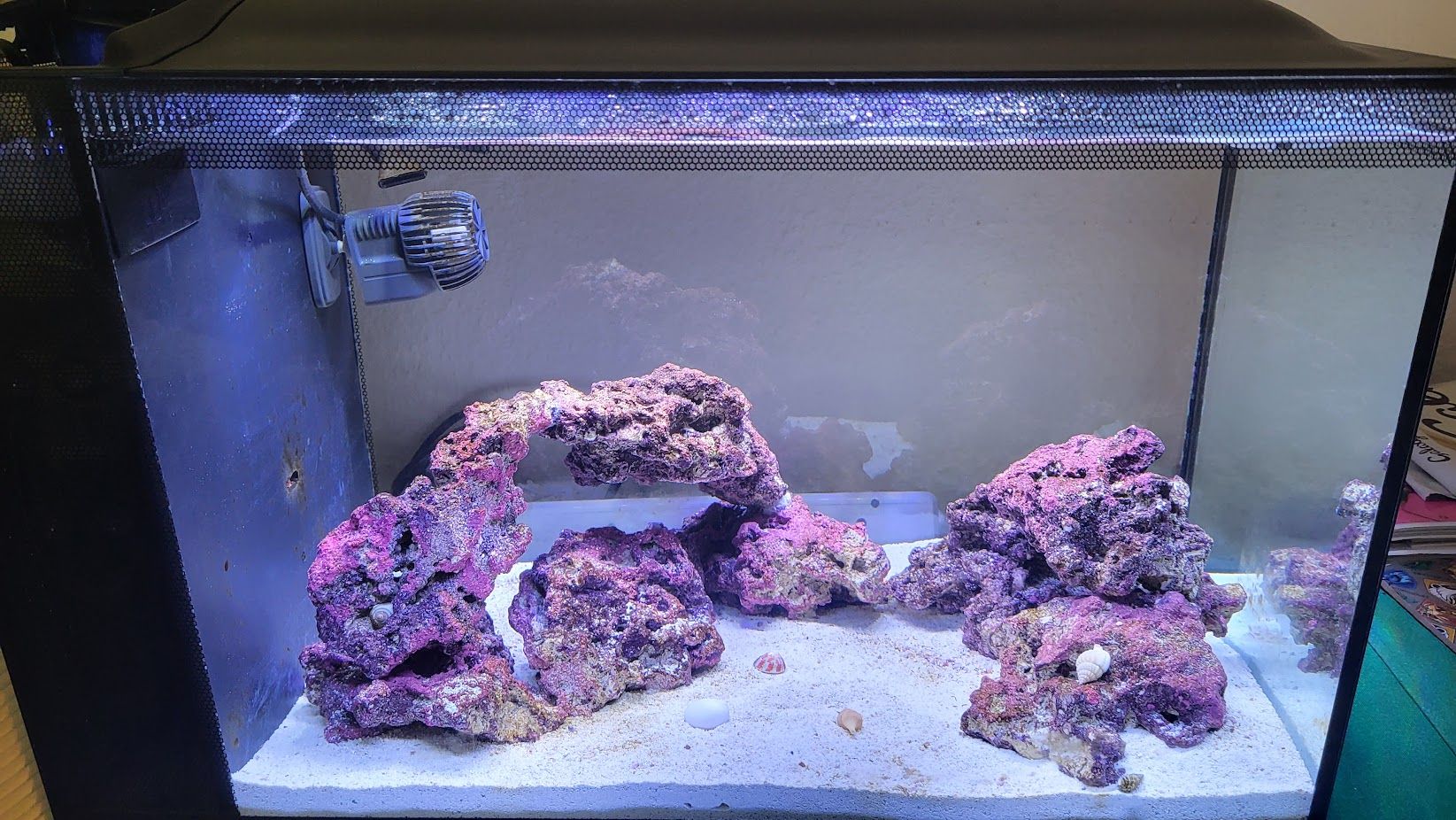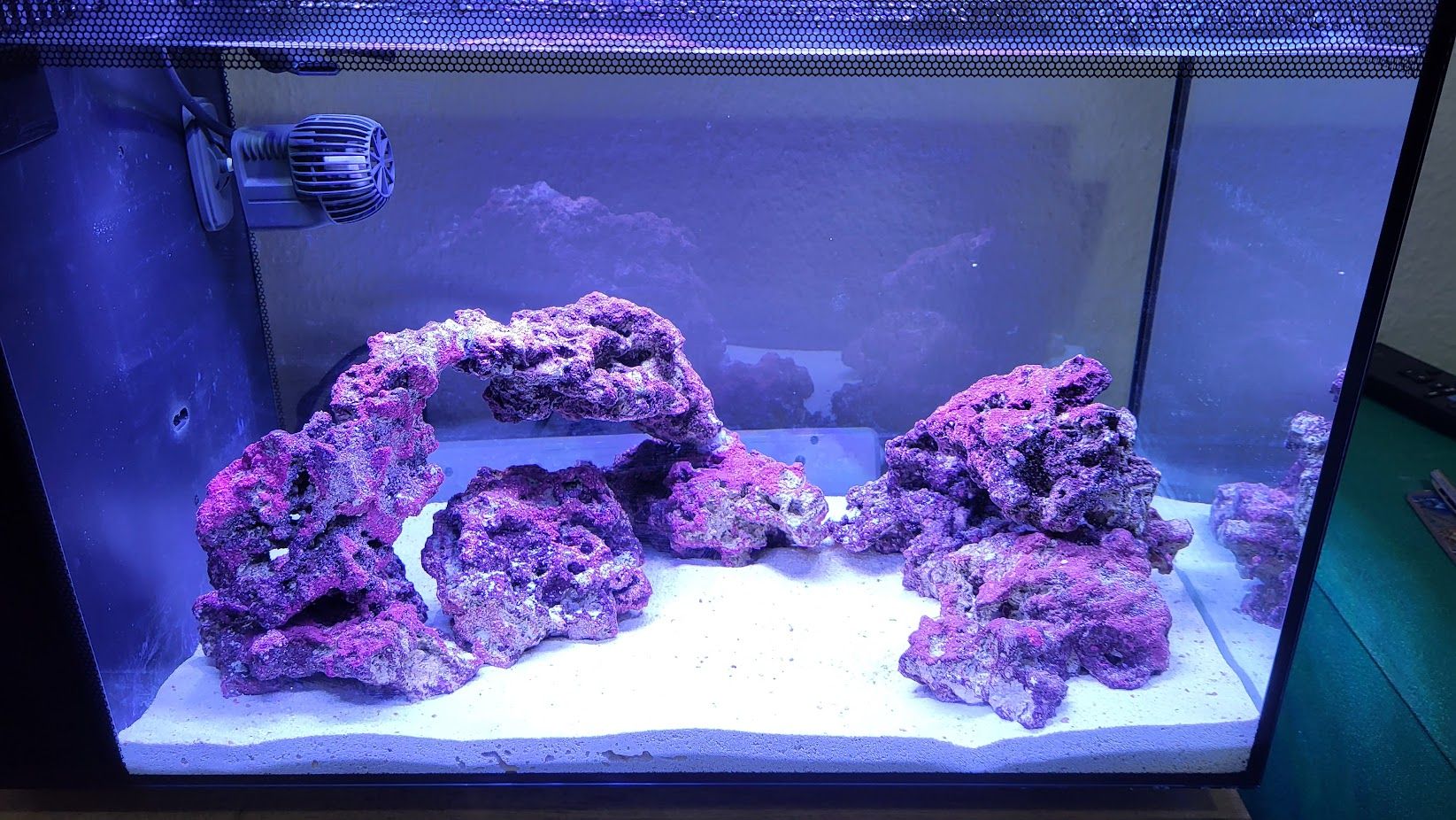 My tank is about a month old, however, I have stolen a filters worth of media from a friend who has had a set up for quite a while and there is some live rock from his sump that i have broken up and is placed in the tank behind the eco reef rock so you can’t see it.