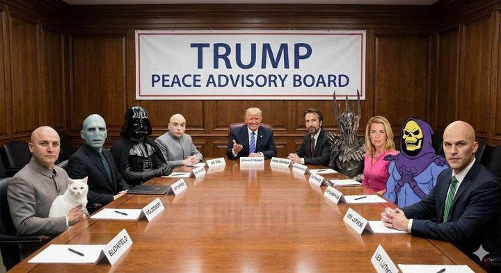 king AI slop. Blofeld (Blowfeld??) is sitting in the seat labelled Voldemort, Lex Luthor has two name plaques, I don't know what it says on Skeletor's name plaque but it certainly doesn't look like Skeletor. Get it right, or don't do it at all!!