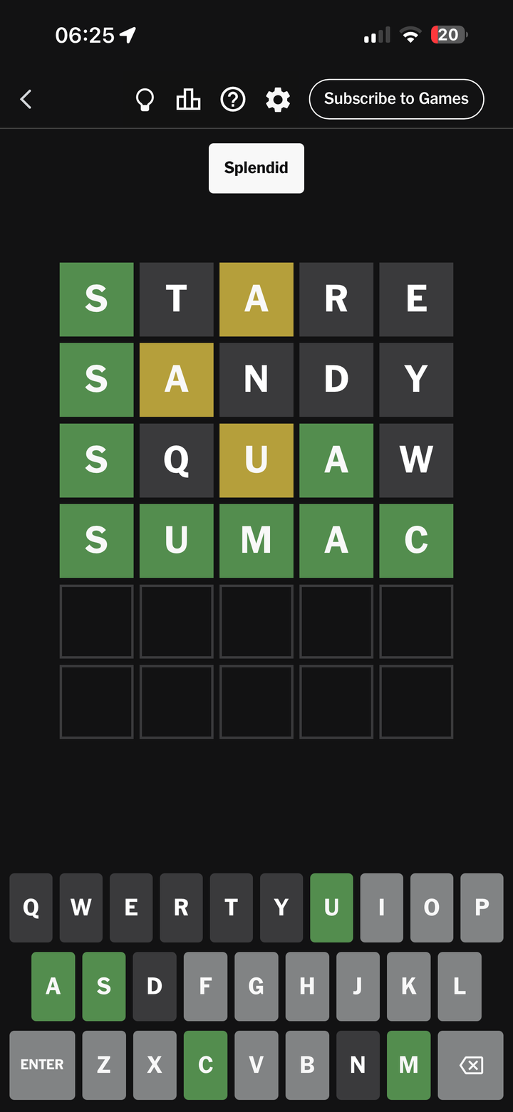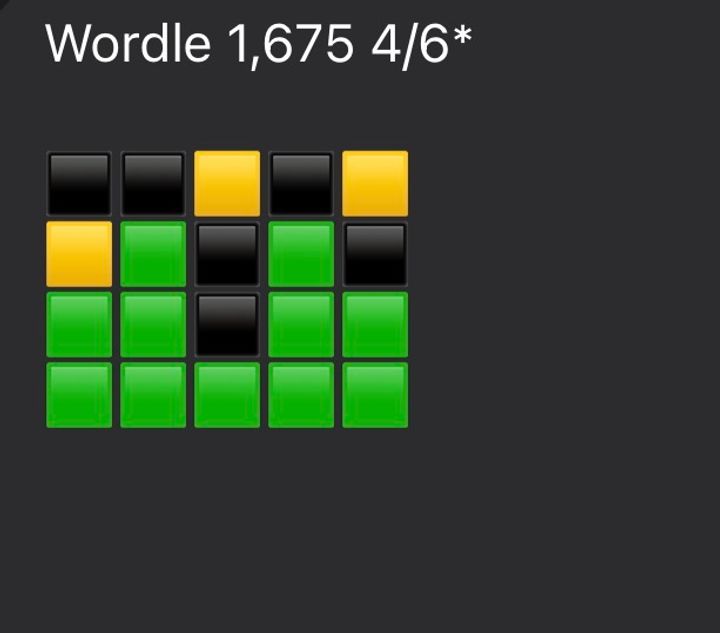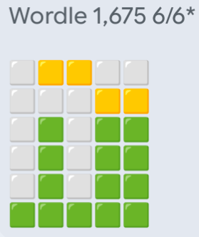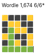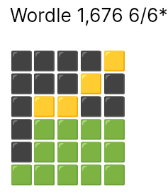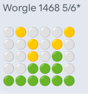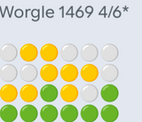 Wordle in 6 and it can do one, I didn't know the word, on row 6 I was randomly putting letters in that looked like they might be a word until it accepted something. Hard mode so I had to keep the yellow and greens I'd found. Worgle in 3. 298 on Blossom with 1 pangram, not the featured one.