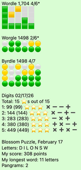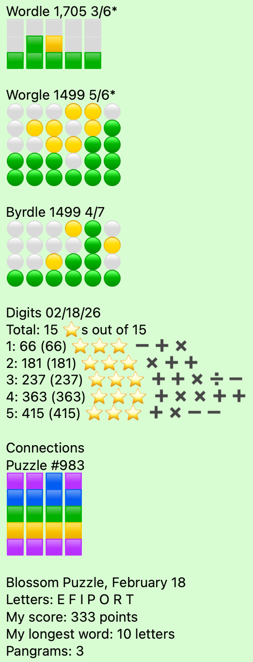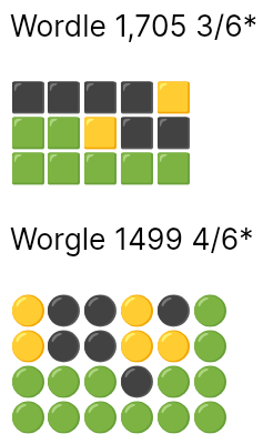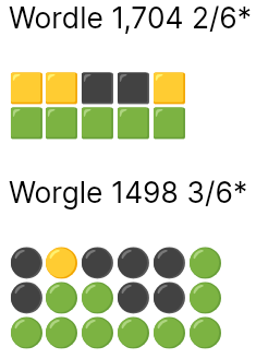 Wordle in 2, Worgle in 3, Wordle is a repeat word. 278 on Blossom with 2 pangrams, it was going well until it wasn't, once I had the good words I didn't see much else.