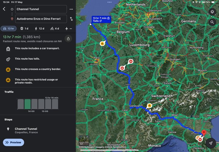 Google says it’s 13 hours from the French side of the Tunnel, if you stick to the speed limits.
