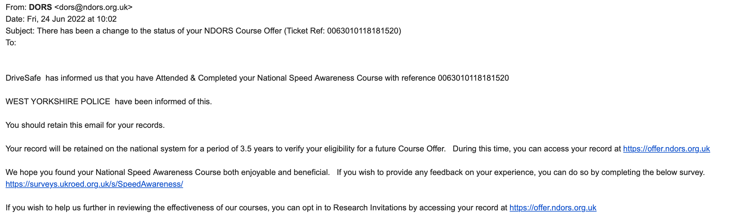 t drivers from our roads AND/OR generate so much revenue from the 'driving without.....' fines that the country wouldn't be (as) bankrupt.Here's the email to show I completed the course?