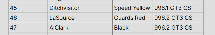 | 47 | AlClark | Black | 996.2 GT3 CS |