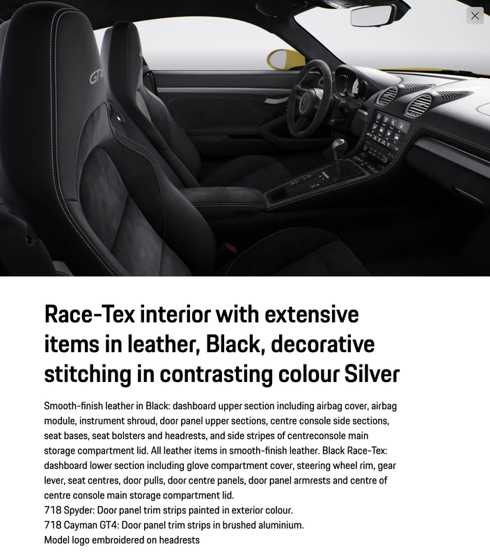 If you don't spec dual zone climate control, you don't get any climate control - just manual adjustment of cabin temperature and fan settings. I'm still subsribed to the Porsche GB email notifications for GT4 and GTS 4.0 cars coming into their network. Tonight's email lists a new GTS 4.0 with all the usual comfort extras like Bose and 18 way seats, plus seat backrests in leather, leather covered steering column casing, leather door sill covers, carbon illuminated door sills. But no climate!
