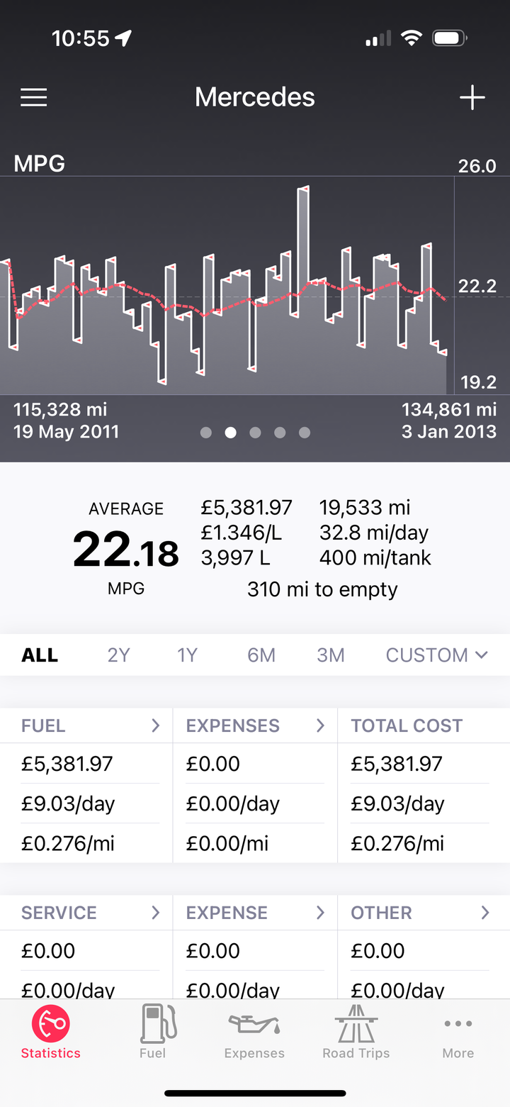 ETA: Looking again at that graph of MPG readings, I suspect the one off 26mpg might have been a data entry error! I do recall that it was fairly consistent no matter how it was driven.