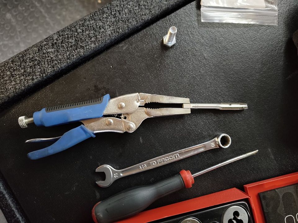 A brief inspection showed why and in keeping with said bush engineering I resorted immediately to pure hope by sticking a tap in a pair of needle nose mole grips because surely that thread in the battery tray was fine and could be salvaged without even removing the battery: