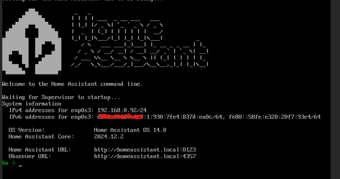 When the HAOS boots, you should end up with a screen on the console like this: