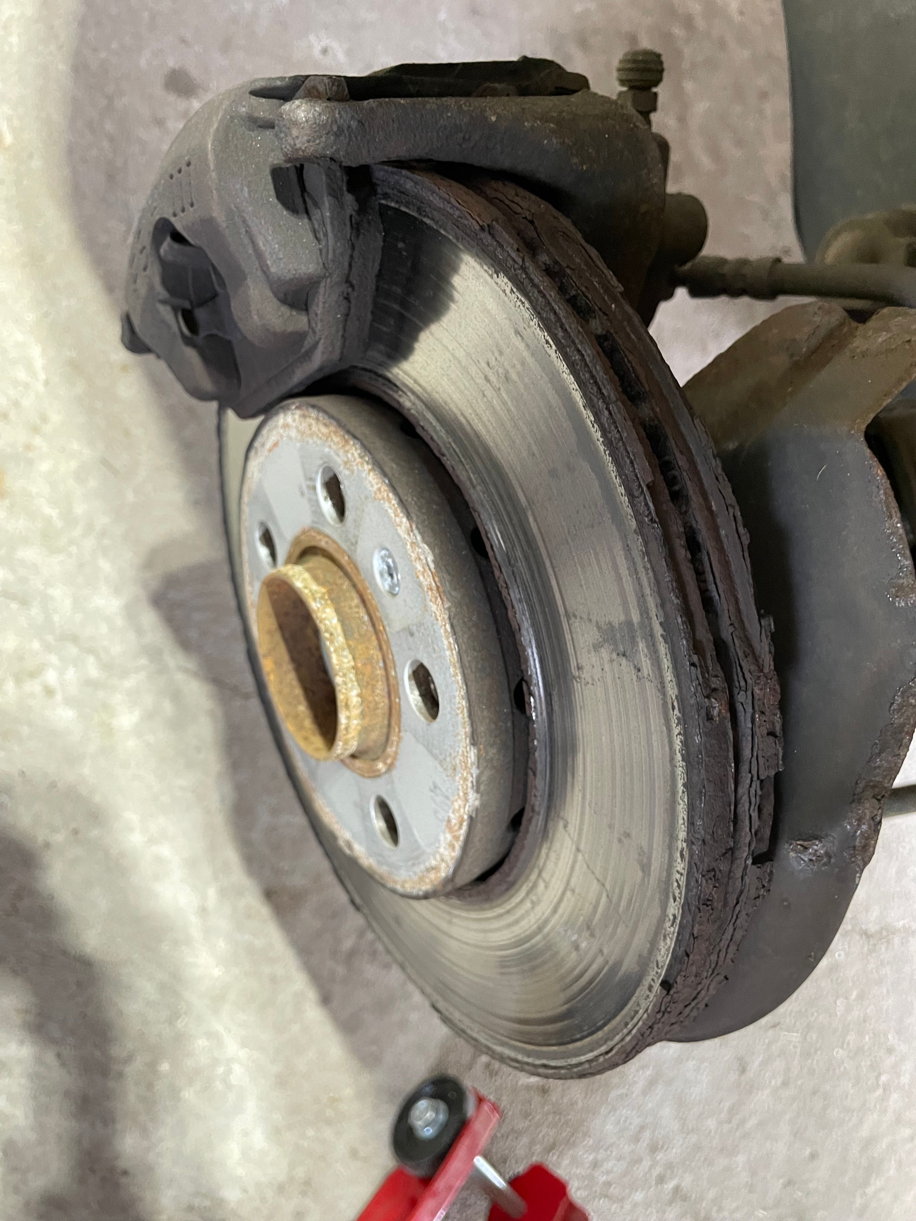 And you can see why the discs were rumbling and the old pads were a bit ridged... When I checked the brakes last year they were a little lipped but not crumbly on the edges. I didn't take any pics of the back of the discs but they were worse... Definitly time for new. I also realised they are the original discs so have been on for 11years and nearly 50k miles so not too bad, though with hindsight perhaps I should have done them last year before they deteriorated further... Not likely to be a problem again for a while at least!