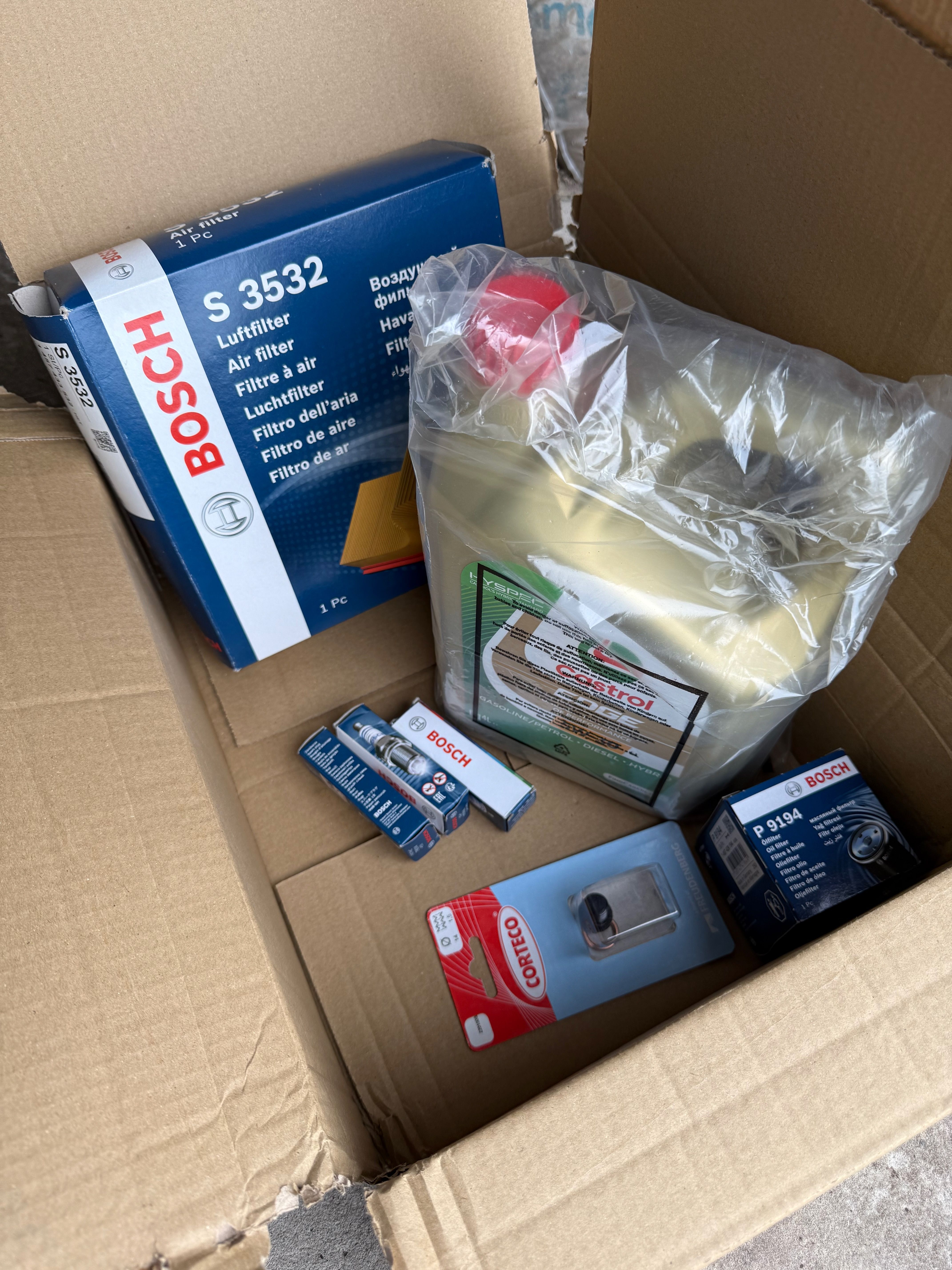 Spark plugs, air and oil filters (and the oil...) and a new sump plug. All went smoothly and to plan (just taking a few hours last weekend whilst it was raining outside) - other than finding the spark and sump plugs and filter canister seemed to have been put on with an airgun - done at a garage previously (you shouldn't really need to use a breaker bar to get any of these off!). I even reset the service reminder and topped up the scented windscreen wash!