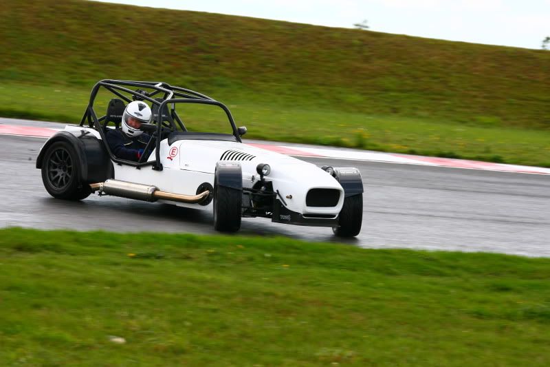 The fourth car I drove was the Cossie powered Westfield. This thing is mental in the dry, let along in the wet (where by now we had had the first of the sporadic showers). 500bhp, suspension and tyres (R888s) set up for dry use, plus a power band that goes from pussy cat to I'm going to fecking pull your face off and st down your neck; in the space of 1000rpm - is not a pleasant thing. The Elite 6-speed sequential gearbox was an absolute joy to use, but with stiff suspension, the car wanted to slide EVERYWHERE, so it took every ounce of concentration to keep it on the track in the prevailing weather conditions. As you couldn't go too fast on the straights (the torque would have lit the tyres up and the diff was too aggressive for wet use, turning the car sideways with the torque reaction if it lit the tyres up in a straight line (V.Scary!)), so I spent around 25 minutes scaring myself sliding around a very damp circuit. Had a couple of BIG slides that I thought I wasn't going to recover from (as did the following cars ), but only spun once (same corner I spun the Ferrari on). The good thing about spending all that time out on track was that there were loads of photos taken from various parts of the circuit: