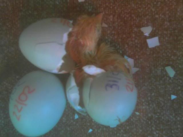 Our first two roosters turned out to be our first rooster and our first hen and started popping out shiney blue eggs so we rustled up an incubator and our first eggs have been hatching 21 days later, 2 yesterday, 1 over night (took him nearly 14 hours to get out!!) and then another 2 during lessons today. Great (and cute) stuff so I thought I'd share!