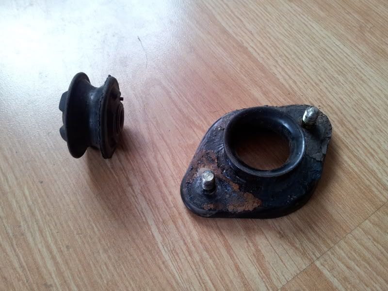 I've had a few E36's, where the metal washer that sits between the shock and the top mount rusts away. This spreads all the load onto the centre of the top mount, which pushes the metal up through the flange.