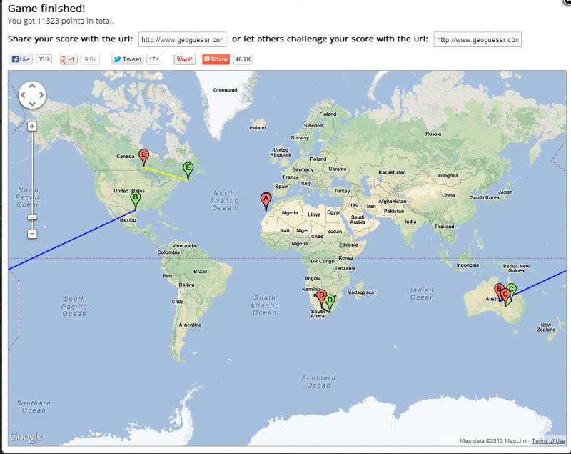 Basically you are shown a picture, and you have to guess where it is. This is my best score, and I doubt I will beat it.