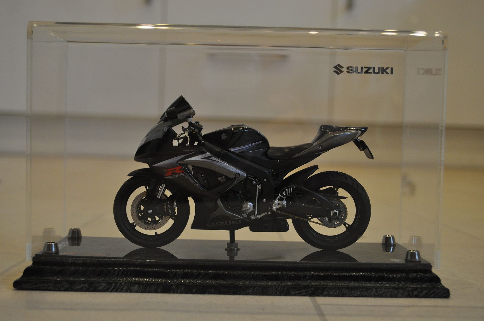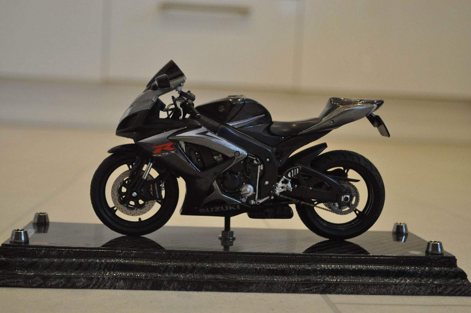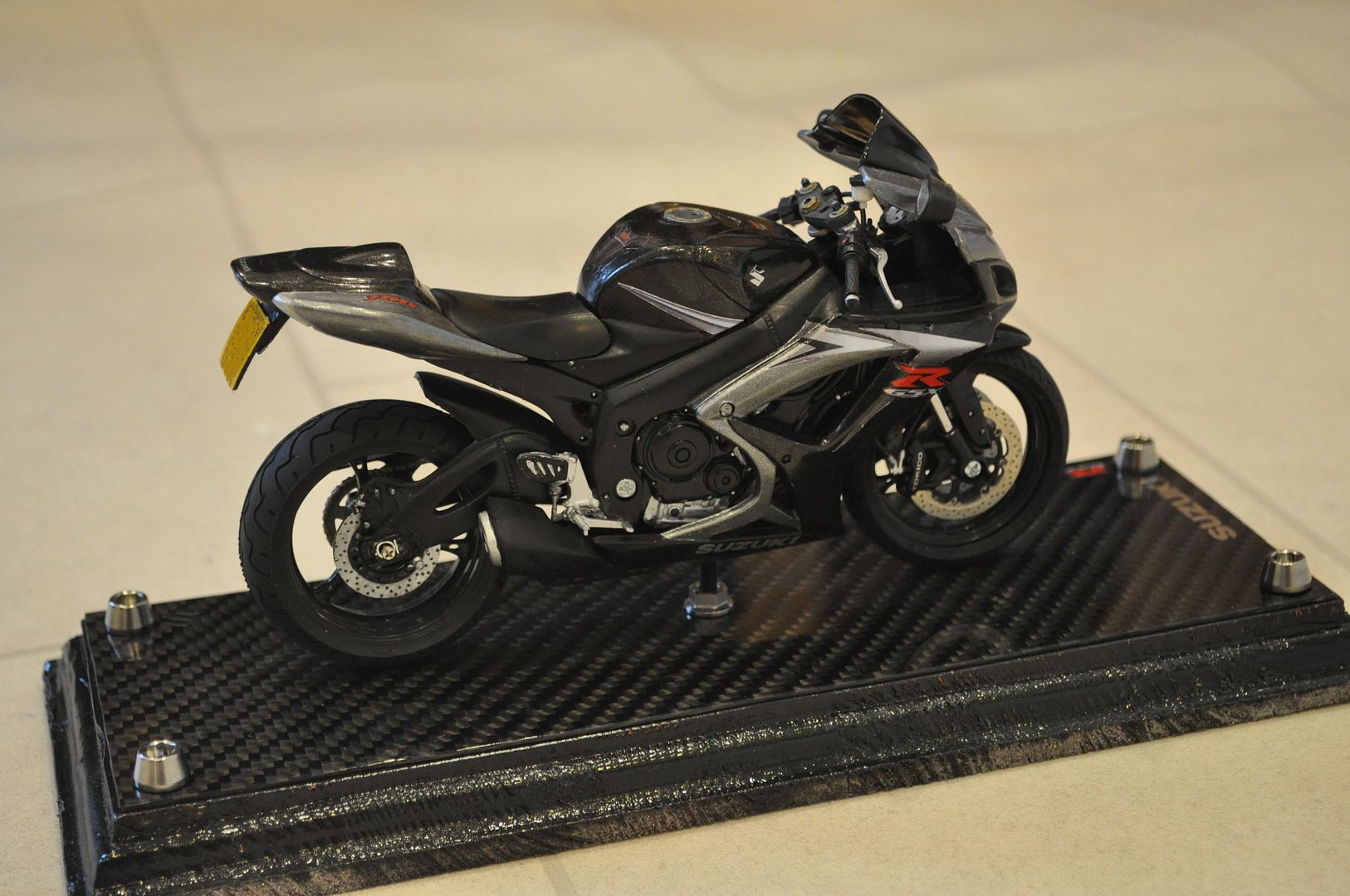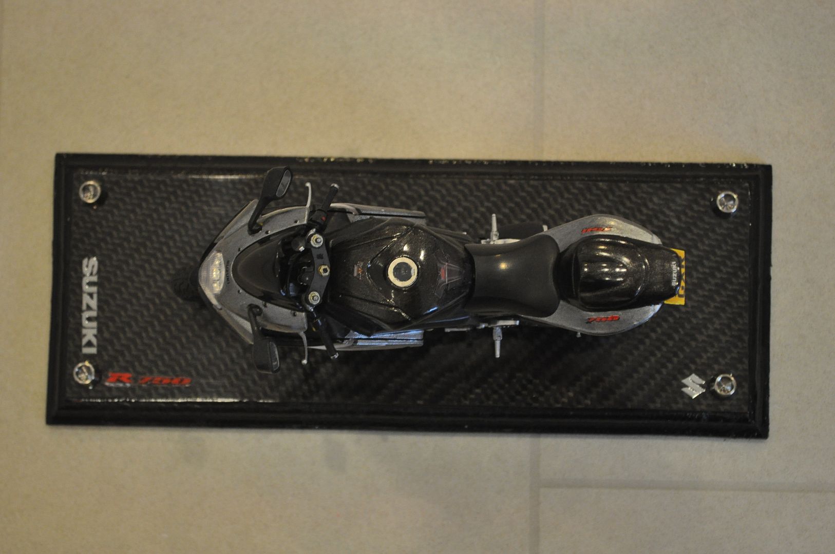 Finally the base was made from a piece of wood I had lying around which had the edges cut with a router to give a shaped profile. Holes were drilled to enable a base plate of real carbon fibre to be secured with titanium bolts. The wood was spray painted black after having been sanded and primed. I found and purchased some metal Suzuki decals from a model shop in Australia, which were placed on the carbon fibre, with the S emblem also placed on the petrol tank.