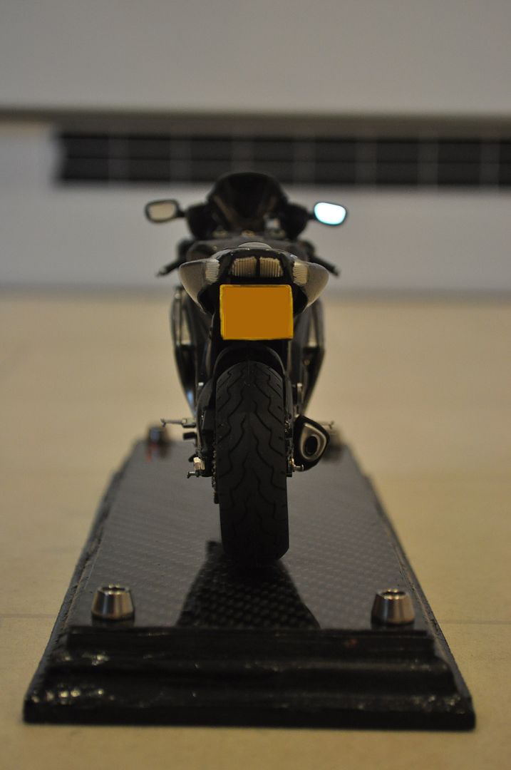 Sorry, I didnt make a diary of the build in pictures, but basically the Maisto model was completely disassembled. The rear sprocket and chain was cut off and replaced with the one from the Tamiya R1 kit. It was a crisply moulded piece and the rear sprocket matched that on the GSXR quite well. Next all the pedals and footpegs were removed. The pegs came from the R1 kit as again they matched the real ones on the bike nicely. Some drilling was required to attach them and their bracket to the model. The gear selector came from the Hyabusa, as did the brake pedal. Next up was fixing the brake discs. The fronts came from the Hyabusa, which required all the holes drilling out. The back brake came from the R1, again with all the holes drilled. The Hyabusa had the photoetched disc surface glued on which is when I realised I should have checked if the holes in it lined up with those in the kit part, doh! Oh well, next time I would have glued it on then drilled the holes. The final modified part was the front forks, including triple tree. This all came from the R1 kit, including the grips and brake/clutch levers. I still required the brake calipers and fork bottom ends, so this part was cut off the Maisto kit with the R1 forks drilled so metal pins could be inserted, over which some 3mm diameter hollow tubing could be placed to represent the polished telescoping part of the forks. Tubing from the Tamiya kits was used for the clutch cable and brake lines, with some scale ignition wire used for the throttle cables. The headlight was a poor representation so the part in the Hyabusa kit was brought into action, which had a separate lens to represent the projector high beam. Some cutting of the Maisto internals was required to get it to fit, with some reflective aluminium paper to show the sidelights. The rear fender was eliminated and modified along with some plastic from the R1 kit to represent the number plate. After painting with Tamiya paints, with silver parts using Humbrol metal colours, photo's of the bike were used to make decals which were printed on decal