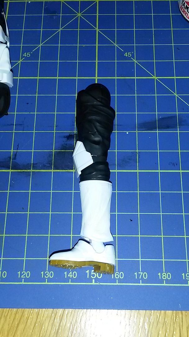 Next came construction of the right leg which has the holster for the troopers sidearm, so far all the white armour has been left in the colour the plastic was moulded in. As they designed the kit to be made without painting, the parts join together where there is a boundary between the different colours on the trooper. This makes painting much easier as you can paint them before joining together, so no need for careful masking. The boots however didn't come together so well, the result means I will have to fill the gap, sand and paint.